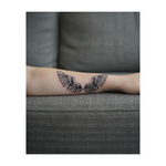 Two big feathered wings spread wide, looking strong and light. This bold tribal-style tattoo feels like freedom, flight, and hope, as if ready to lift someone into the sky.