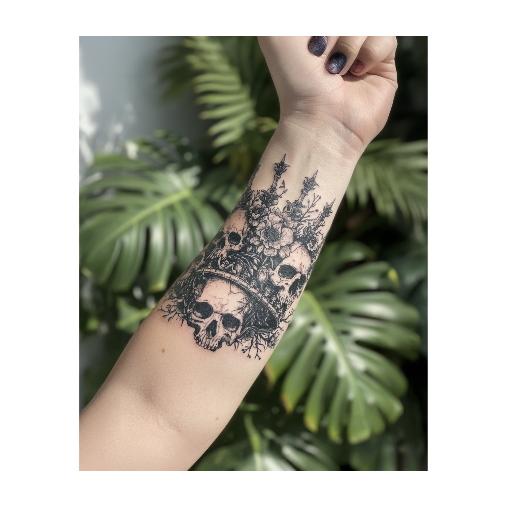 Four skulls rest among roses and thorns, topped with tall, spiky candles. This blackwork tattoo shows beauty and death woven together in dark, royal style.