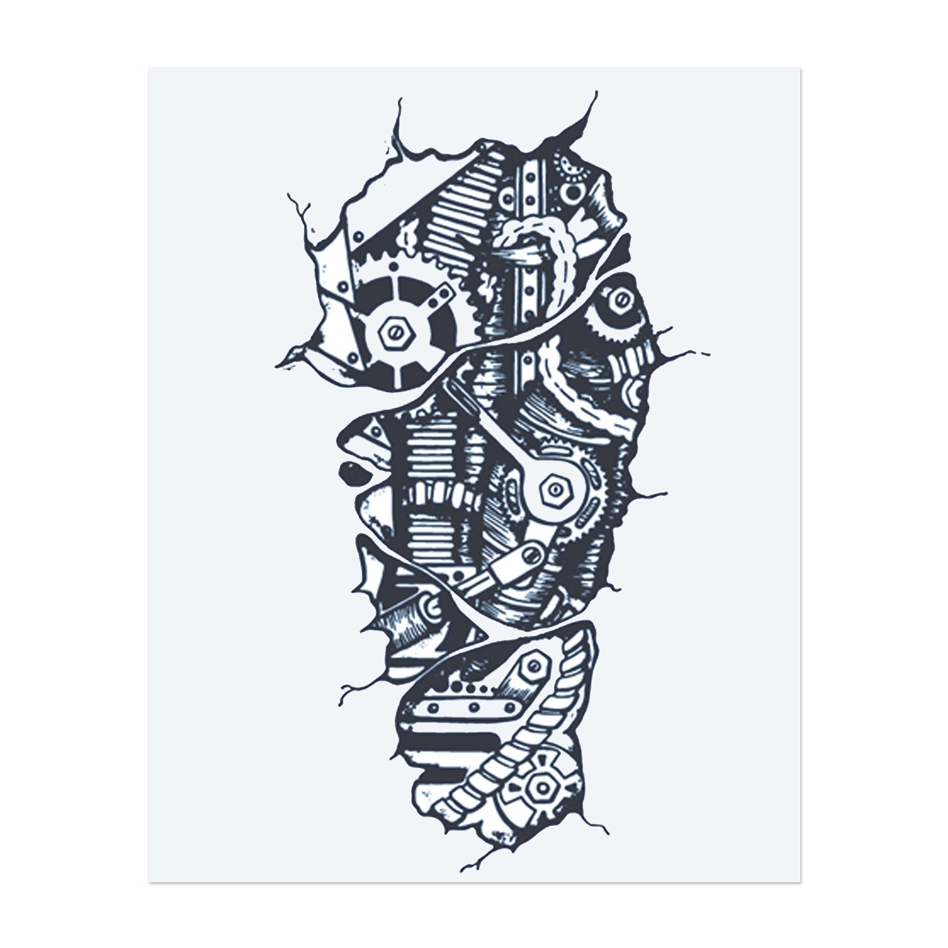 A tattoo showing torn skin revealing intricate gears, cogs, and machinery underneath. This biomechanical design symbolizes the fusion of man and machine, representing strength, precision, and a futuristic spirit. Perfect for those who embrace technology and resilience.