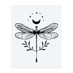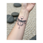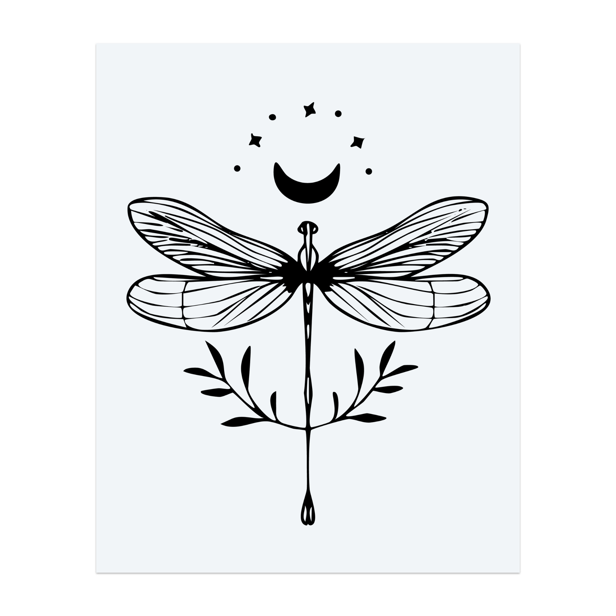 A delicate minimalist tattoo of a dragonfly with leafy wings, flying under a crescent moon and tiny stars. It tells a story of magic, night skies, and nature’s gentle beauty.