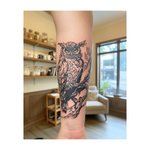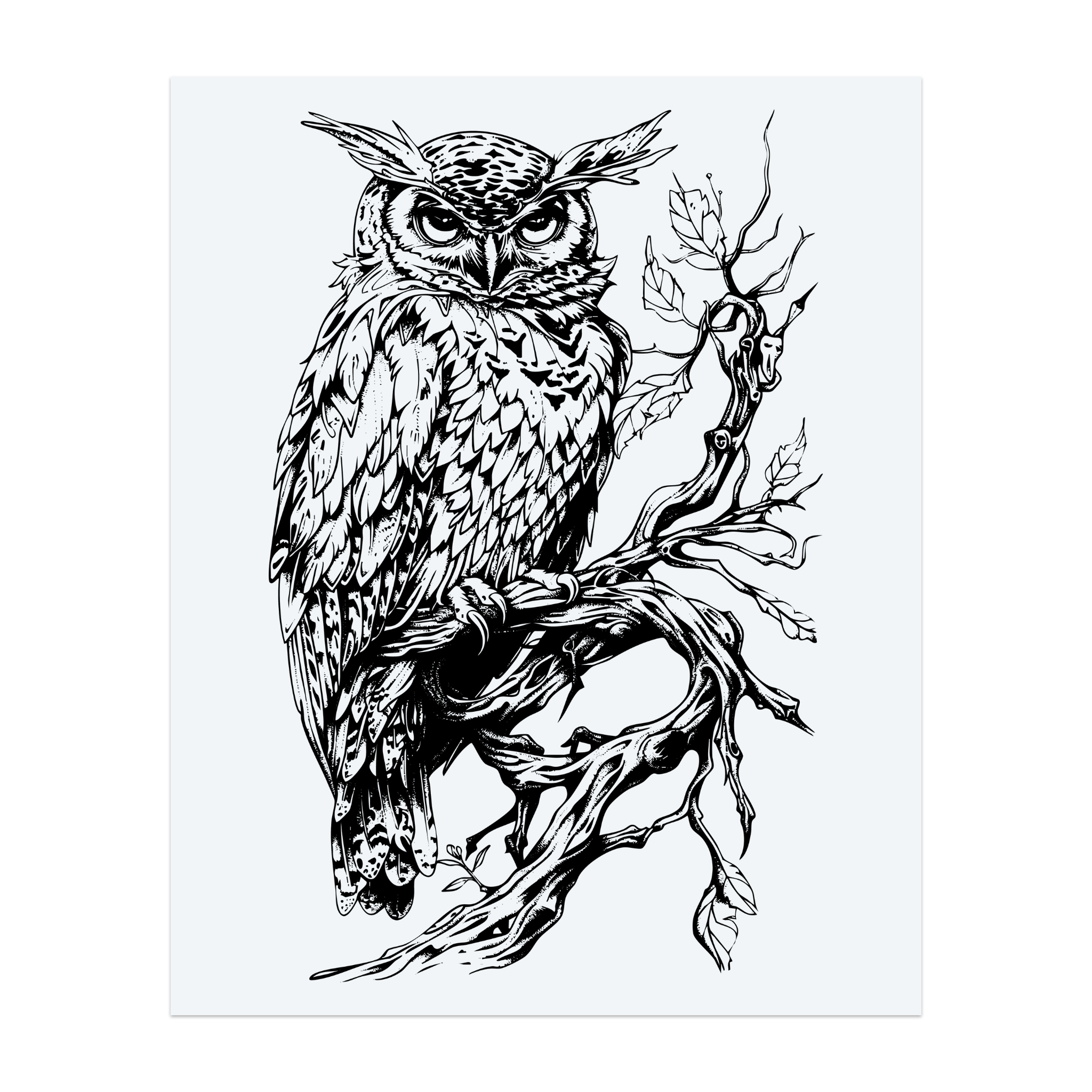 A wise owl sits calmly on a twisted tree branch, its sharp eyes glowing with mystery. This blackwork tattoo shows silent strength and the magic of the night.