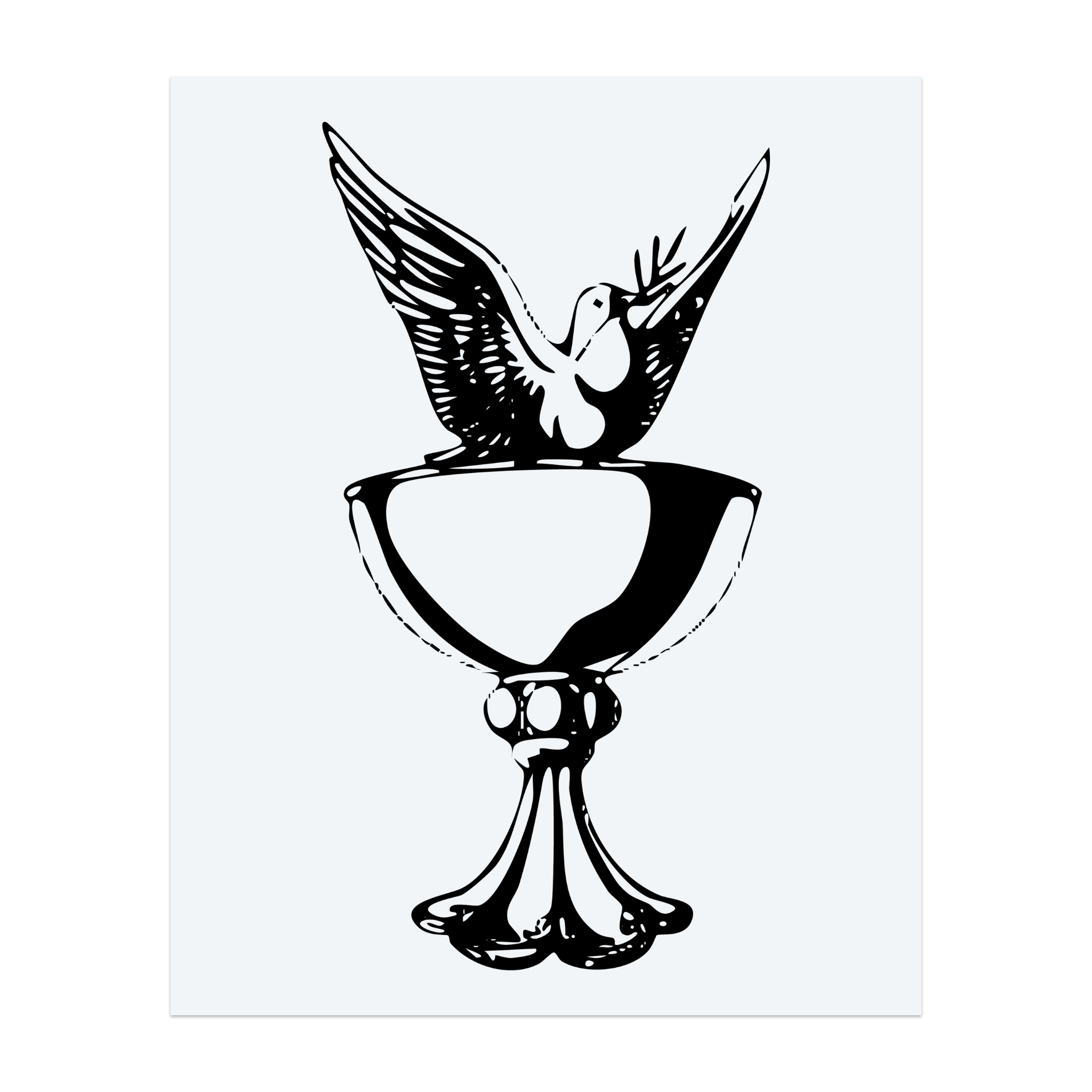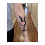 A bold blackwork tattoo of a dove carrying an olive branch, rising from a chalice. It tells a story of hope, peace, and faith, symbolizing light and renewal even after struggle.