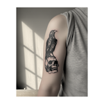 A dark raven sits proudly on a skull, guarding secrets of the night. This blackwork tattoo shows mystery and strength, like a silent watcher in the shadows.