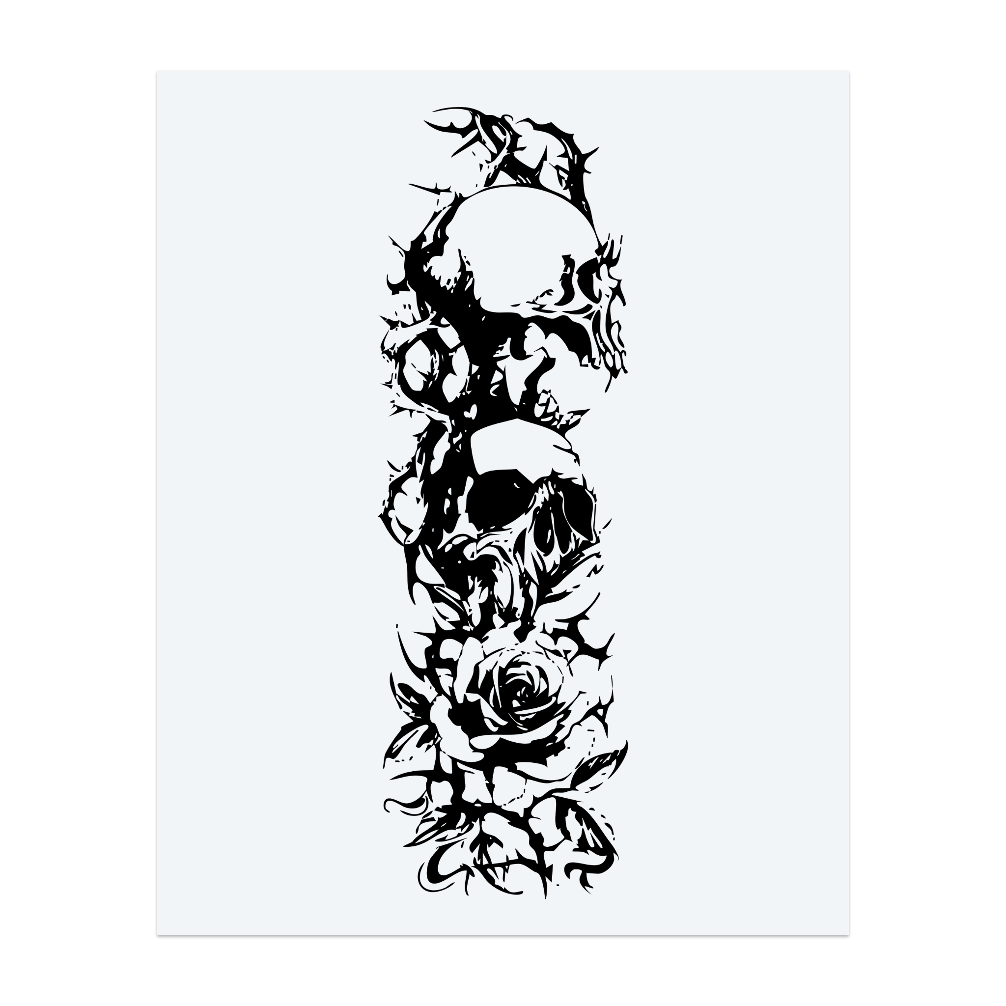 This tribal tattoo shows skulls tangled in thorny vines with roses blooming below. It tells a story of life and death, showing beauty and danger locked together in one design.