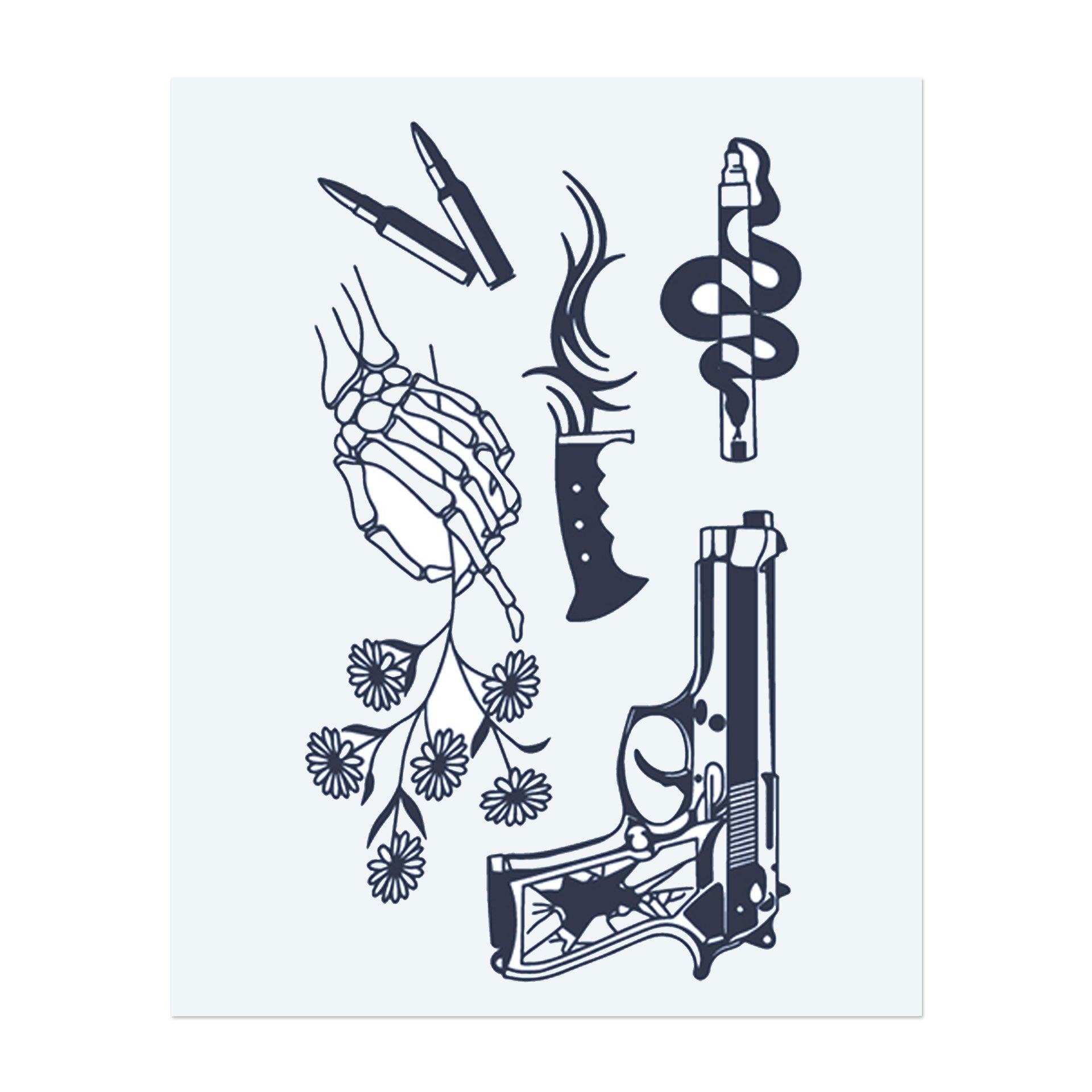 A bundle of contrasting symbols: a pistol, a knife, a skeleton hand, a snake, a flower bouquet, and a bullet. These designs represent the balance of life and death, danger and beauty, capturing both elegance and raw power.
