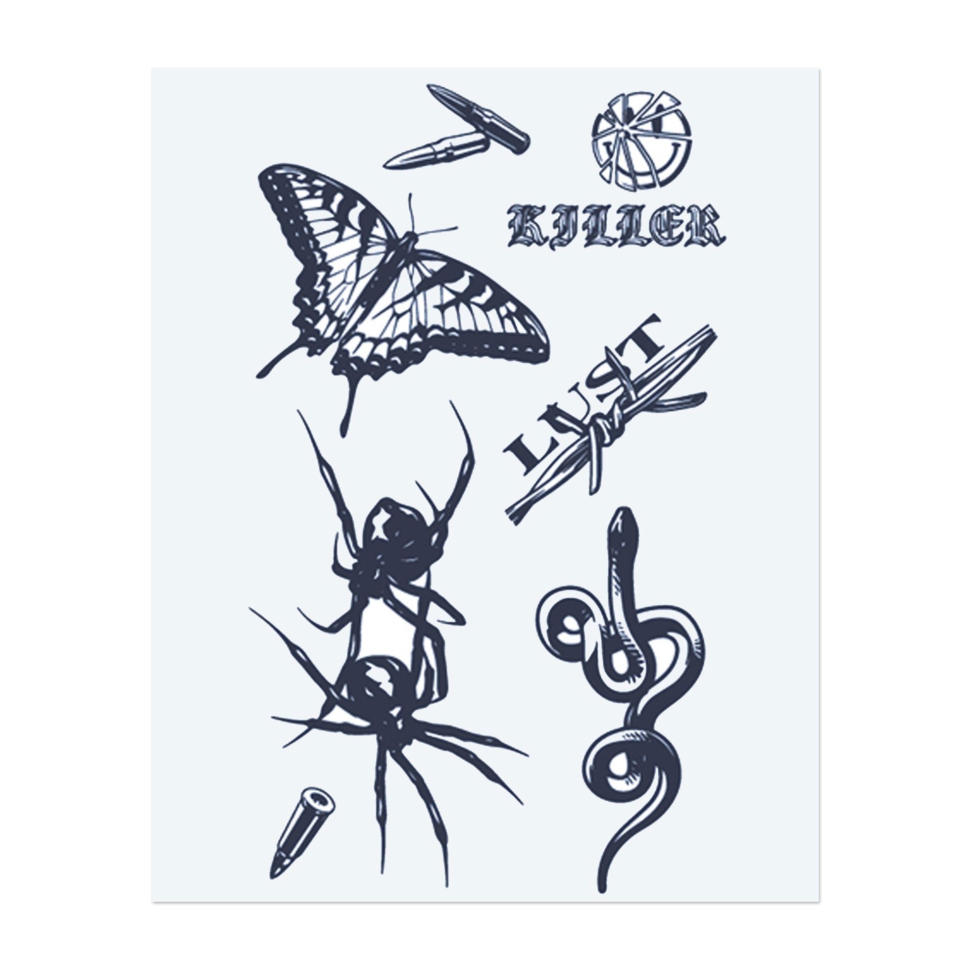 A bundle of bold, edgy symbols: a butterfly, a spider, a snake, bullets, and the words "KILLER" and "LUST." These designs represent danger, temptation, and power, blending dark beauty with raw, untamed energy.