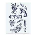 A bundle of intense designs: a heart pierced by swords, a snake with its mouth open, two clasped hands, crying eyes, a dagger, and a butterfly. These tattoos represent pain, betrayal, resilience, and transformation, blending both beauty and danger.