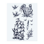 A bundle of classic symbols: two flying birds, a "GOOD LUCK" horseshoe with flowers, a ship sailing on waves, and a dagger with flowers. These designs capture the adventurous spirit, hope, and protection in a sailor's journey.