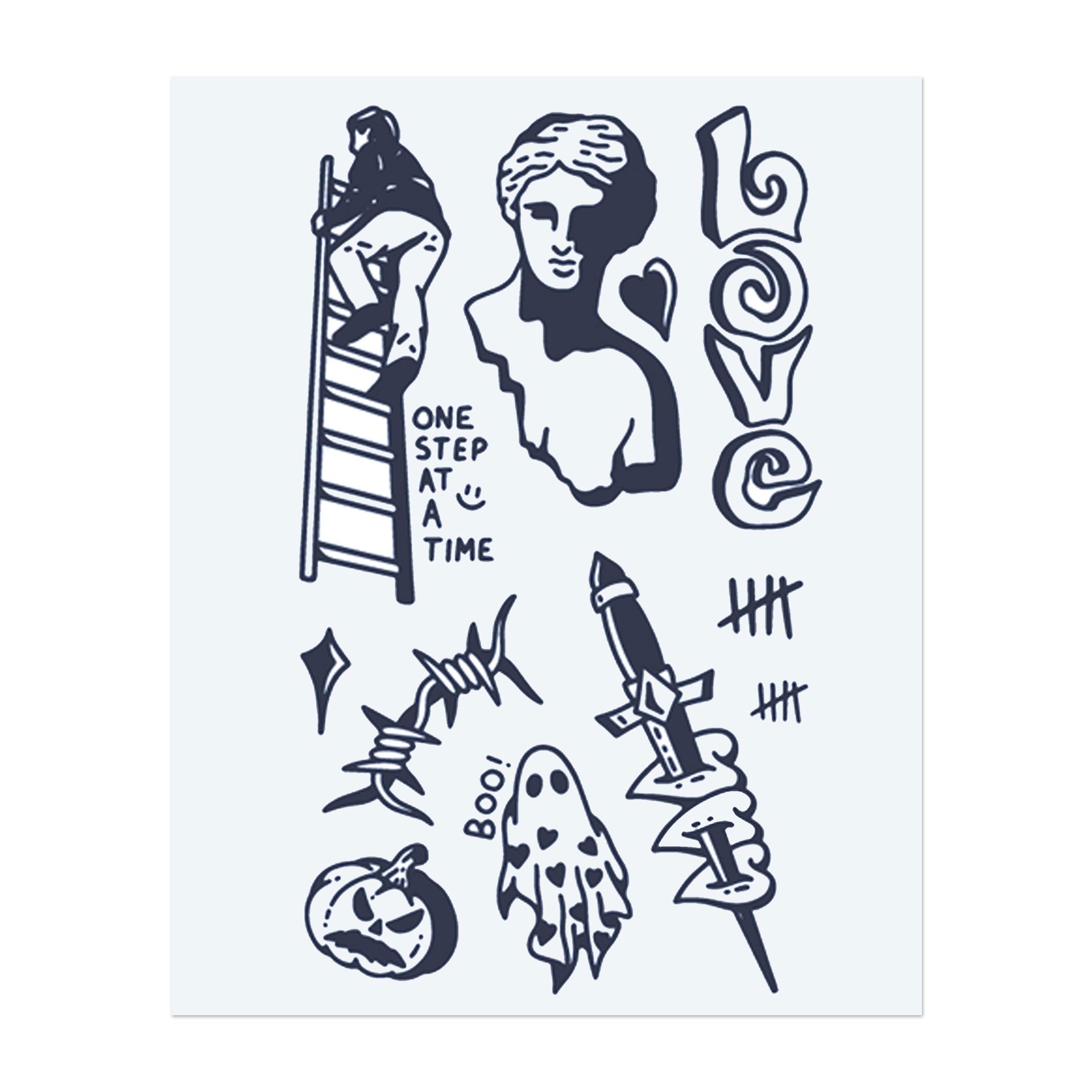 A bundle of diverse symbols: a person climbing a ladder with "ONE STEP AT A TIME," a classical bust, the word "LOVE," a spooky pumpkin and ghost, a sword, and barbed wire. These designs blend themes of progress, love, mystery, and strength.