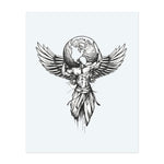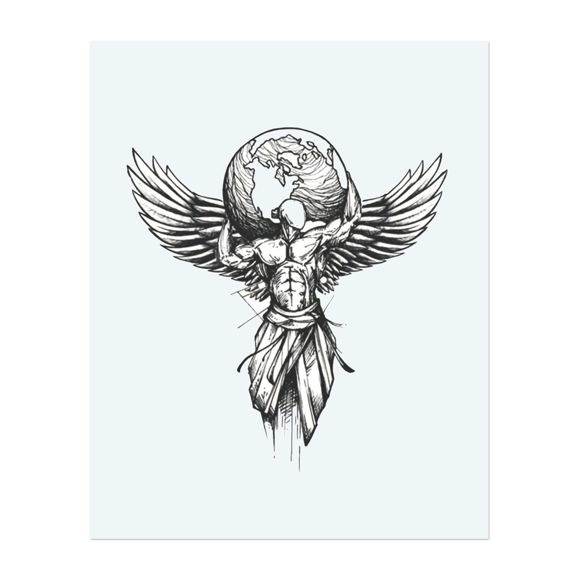 This powerful tattoo depicts a muscular, winged figure carrying the weight of the earth on her shoulders. Dressed in a flowing robe and adorned with bold lines, this design symbolizes strength, sacrifice, and divine duty, where myth meets celestial protection.