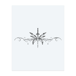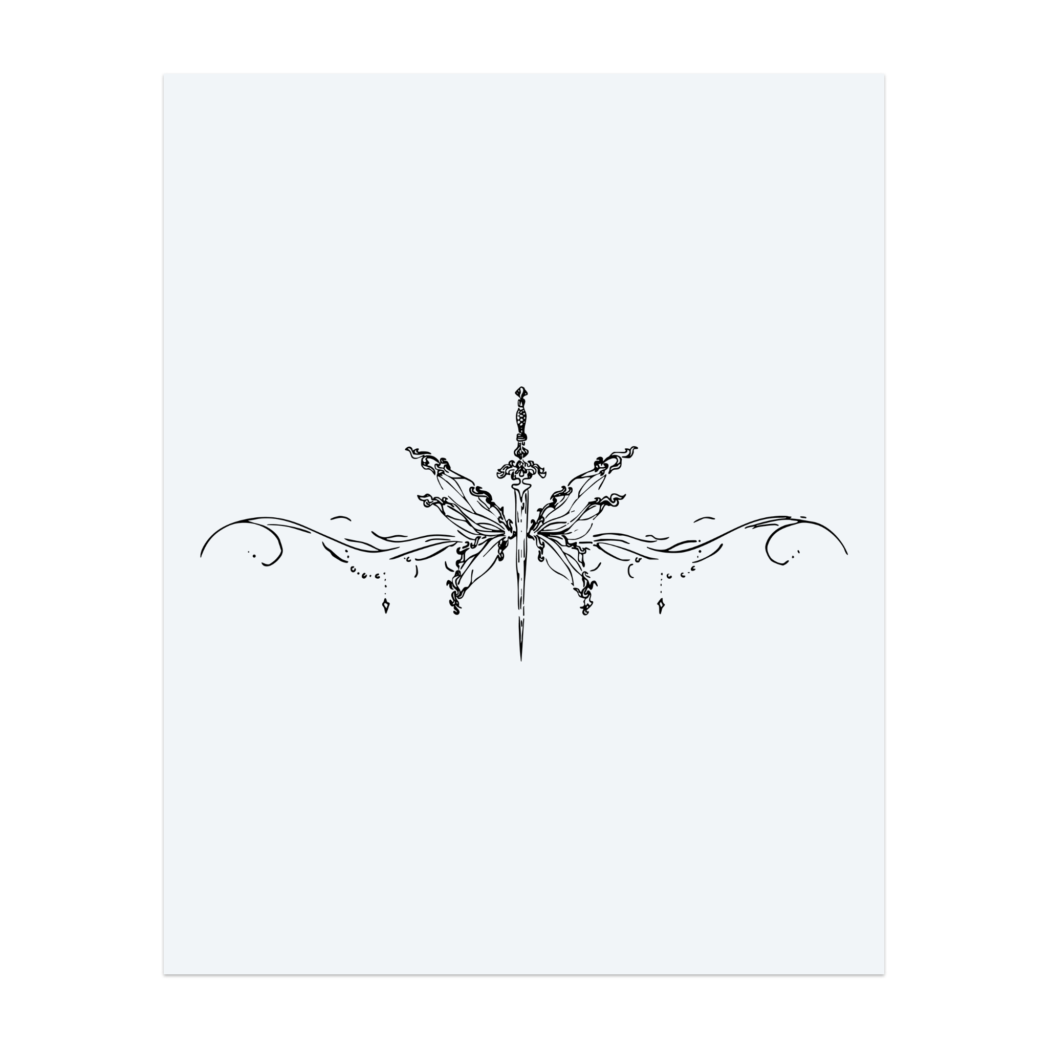 A shining sword stands tall, its hilt sprouting elegant wings made of flowing flames and curls. This fine-line tattoo blends fantasy and grace, symbolizing balance of strength and beauty in a magical style.
