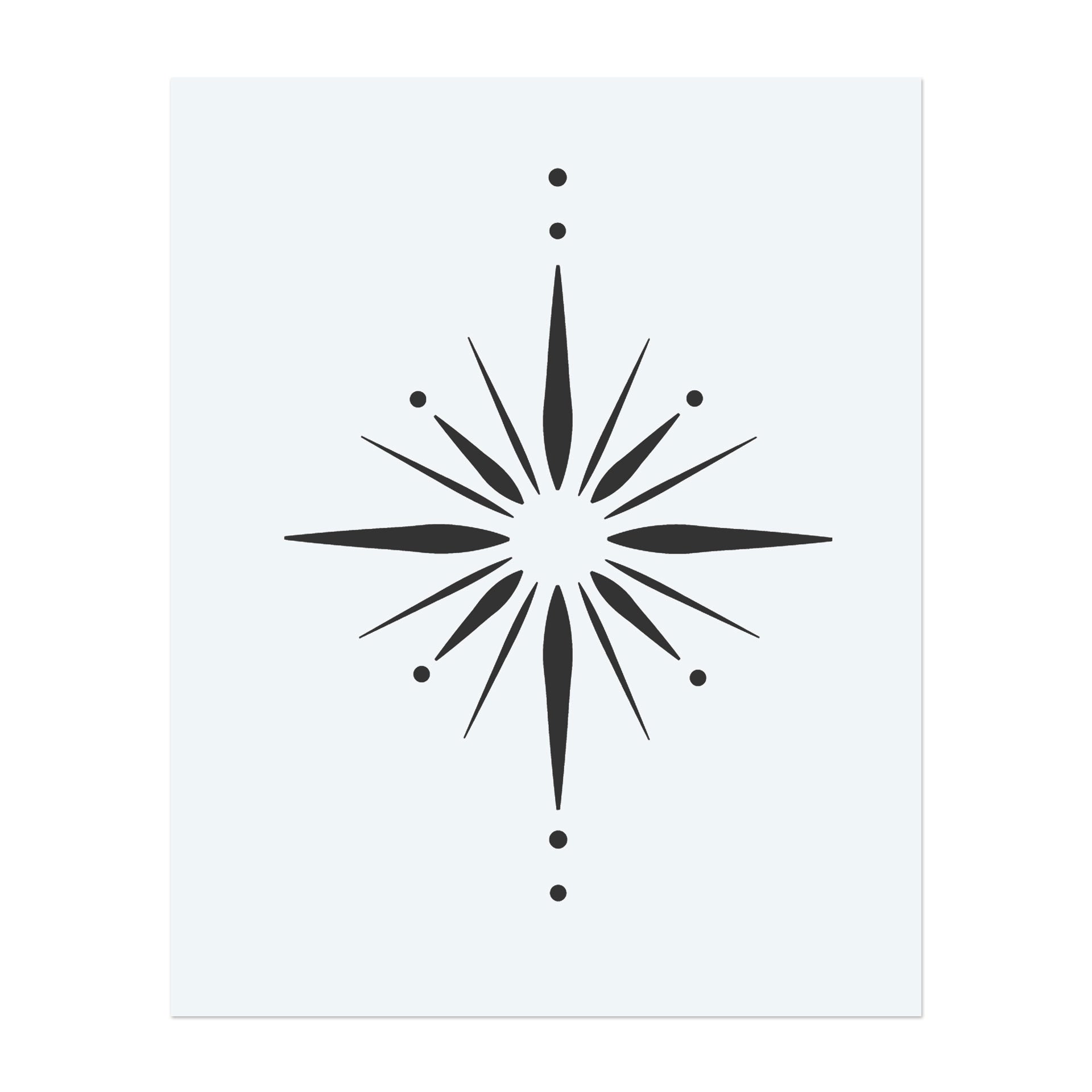 A striking, symmetrical star flash with sharp rays and dotted accents emanating from the center. This geometric design symbolizes light, clarity, and guidance—perfect for a striking, celestial-inspired statement.