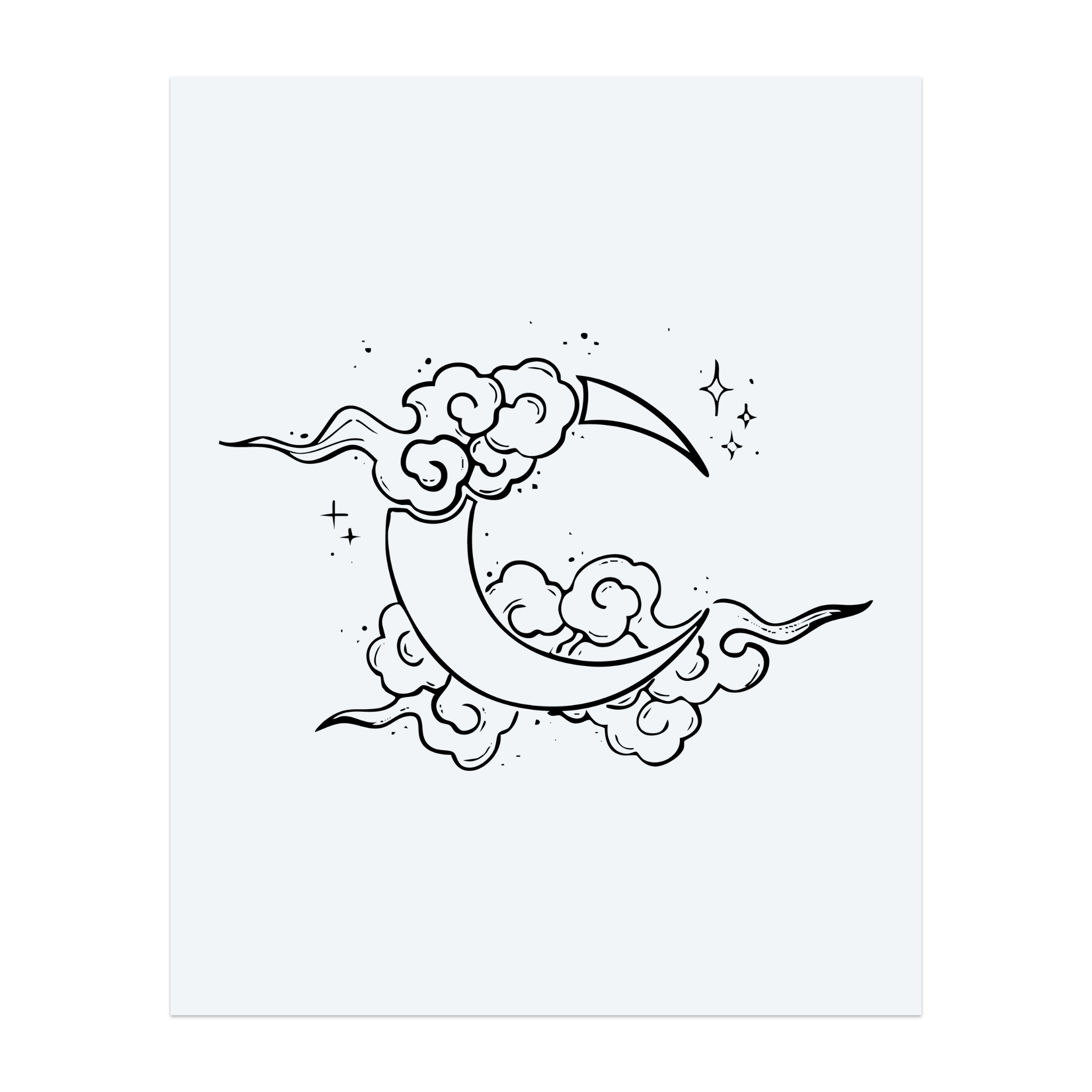 A minimalist tattoo of a crescent moon surrounded by soft, swirly clouds and tiny stars. It feels dreamy and calm, like a night sky full of wonder and quiet magic.