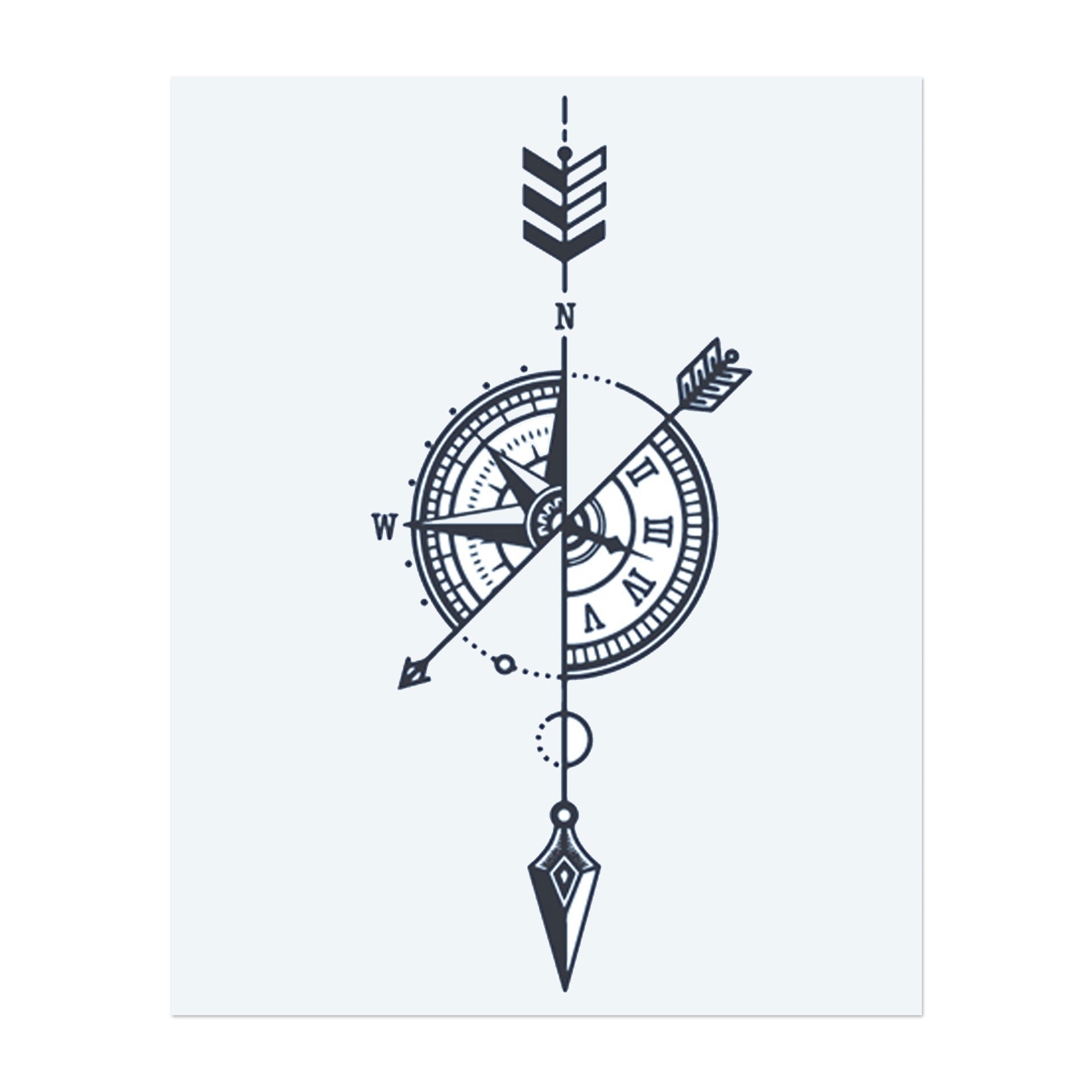 A detailed compass with a clock and arrows pointing in different directions. This tattoo symbolizes guidance, adventure, and the passage of time. A perfect design for someone who values exploration and finding their true path in life.
