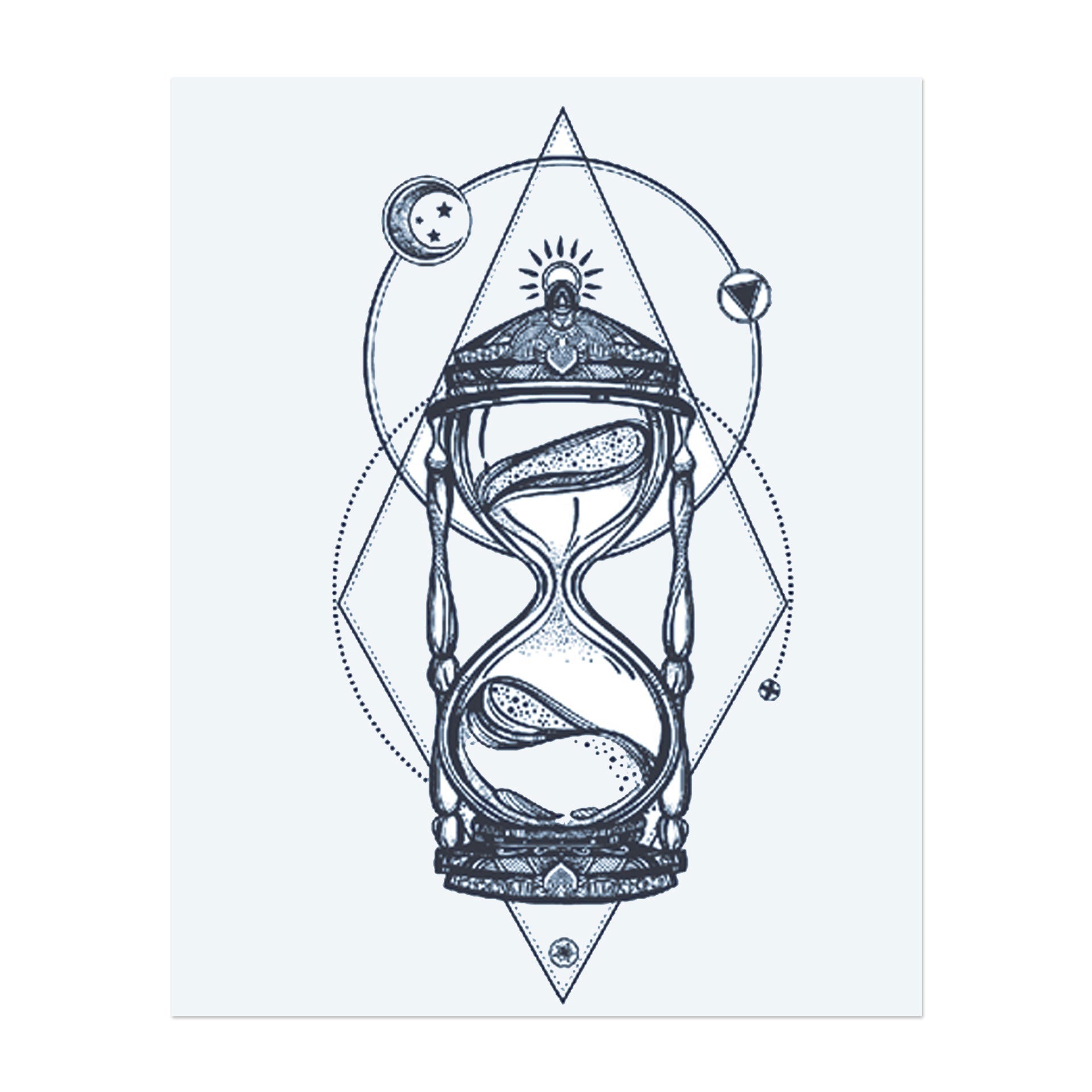 An intricate hourglass, surrounded by celestial symbols like the sun, moon, and stars, set within a geometric frame. This design symbolizes the passage of time, balance, and the connection between the cosmos and our lives. Perfect for someone who values the fleeting nature of time and the mysteries of the universe.