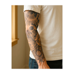 This sleeve blends a skull with geometric patterns and an all-seeing eye, symbolizing the connection between life, death, and the divine insight that guides us. The intricate design represents the mysteries of existence and the unfolding of destiny.