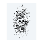 Two smiling pumpkins sit among flowers, dice, and bats under sparkly stars. This blackwork tattoo mixes Halloween fun with a bit of spooky luck and charm.
