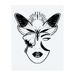 A blackwork tattoo of a woman’s face joined with a butterfly, a crescent moon, and a glowing sun above. It tells a story of balance between night and day, showing beauty, mystery, and transformation.