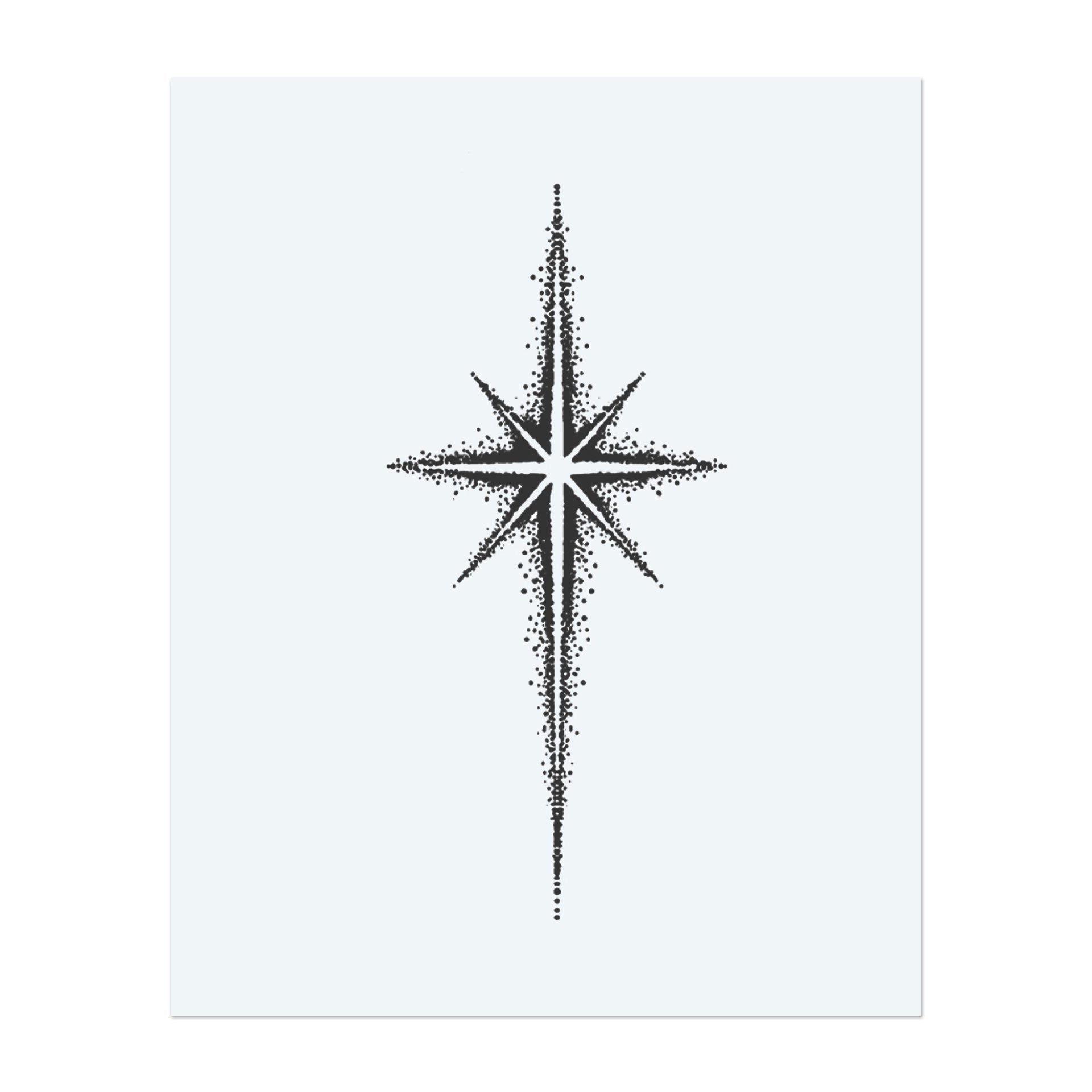 This minimalist tattoo depicts a radiant eight-pointed star with a precise dot pattern. This design symbolizes direction, hope, and inner light, evoking celestial navigation and serving as a timeless symbol of guidance through life's darkest paths.