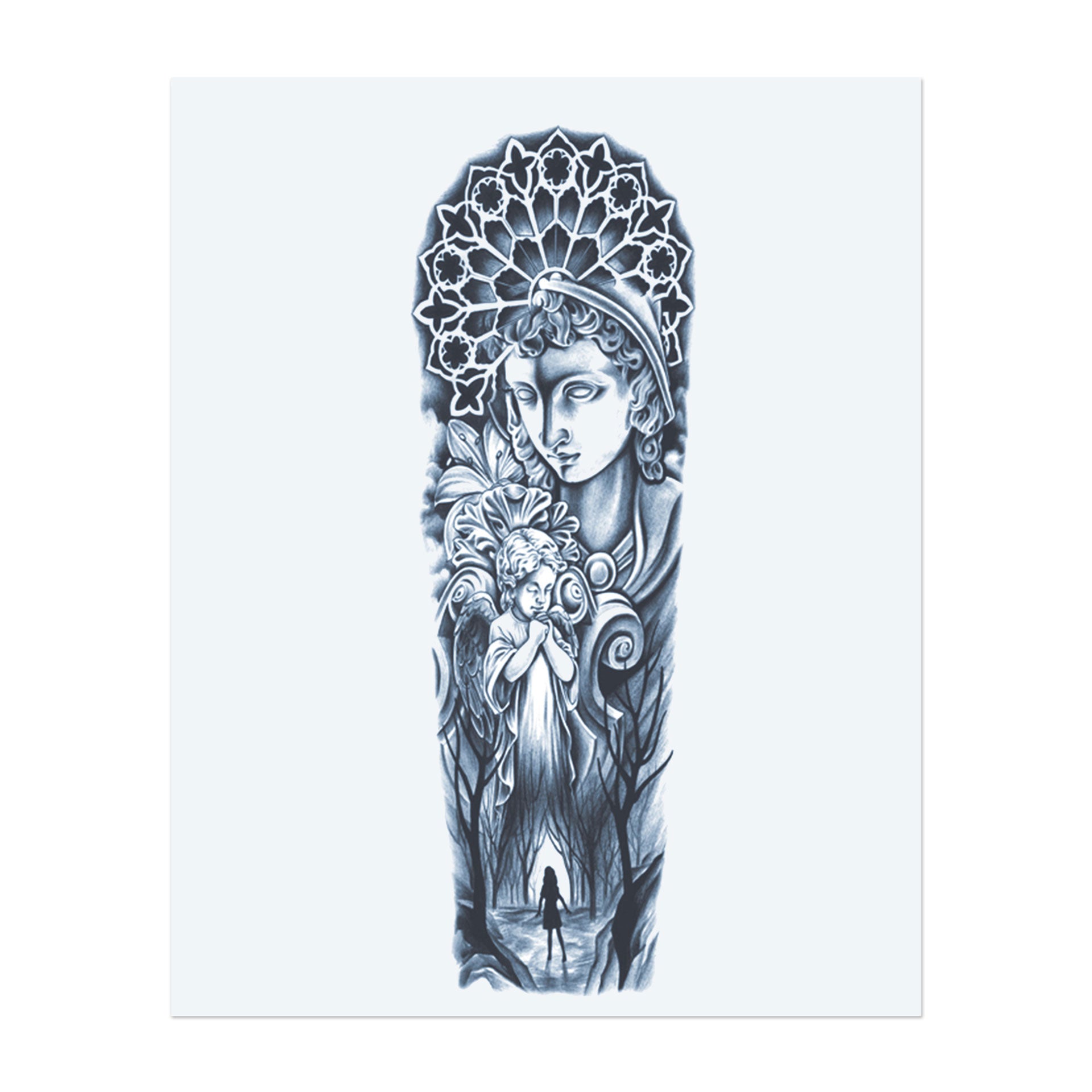 Realistic, detailed tattoo featuring a Madonna figure, angelic child, and a lone person walking through a dark forest. Includes gothic ornaments and spiritual symbolism.