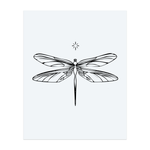 A dragonfly with long, clear wings hovers under a tiny shining star. This minimalist tattoo shows lightness, change, and magic, as if the dragonfly is chasing starlight in the night sky.