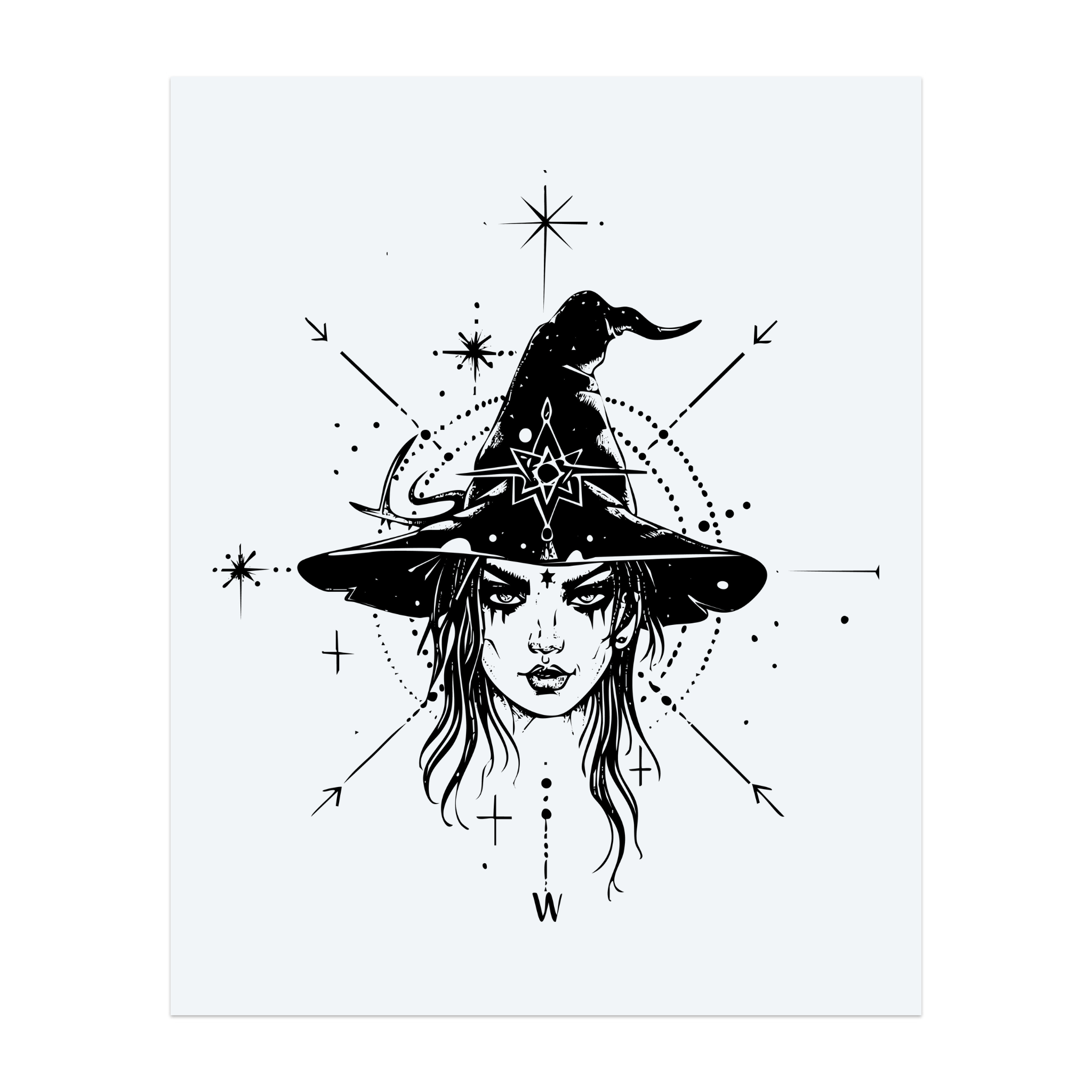A powerful witch with long hair and a tall hat stands under shining stars and magic signs. This blackwork tattoo shows mystery, strength, and cosmic beauty in one magical design.