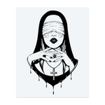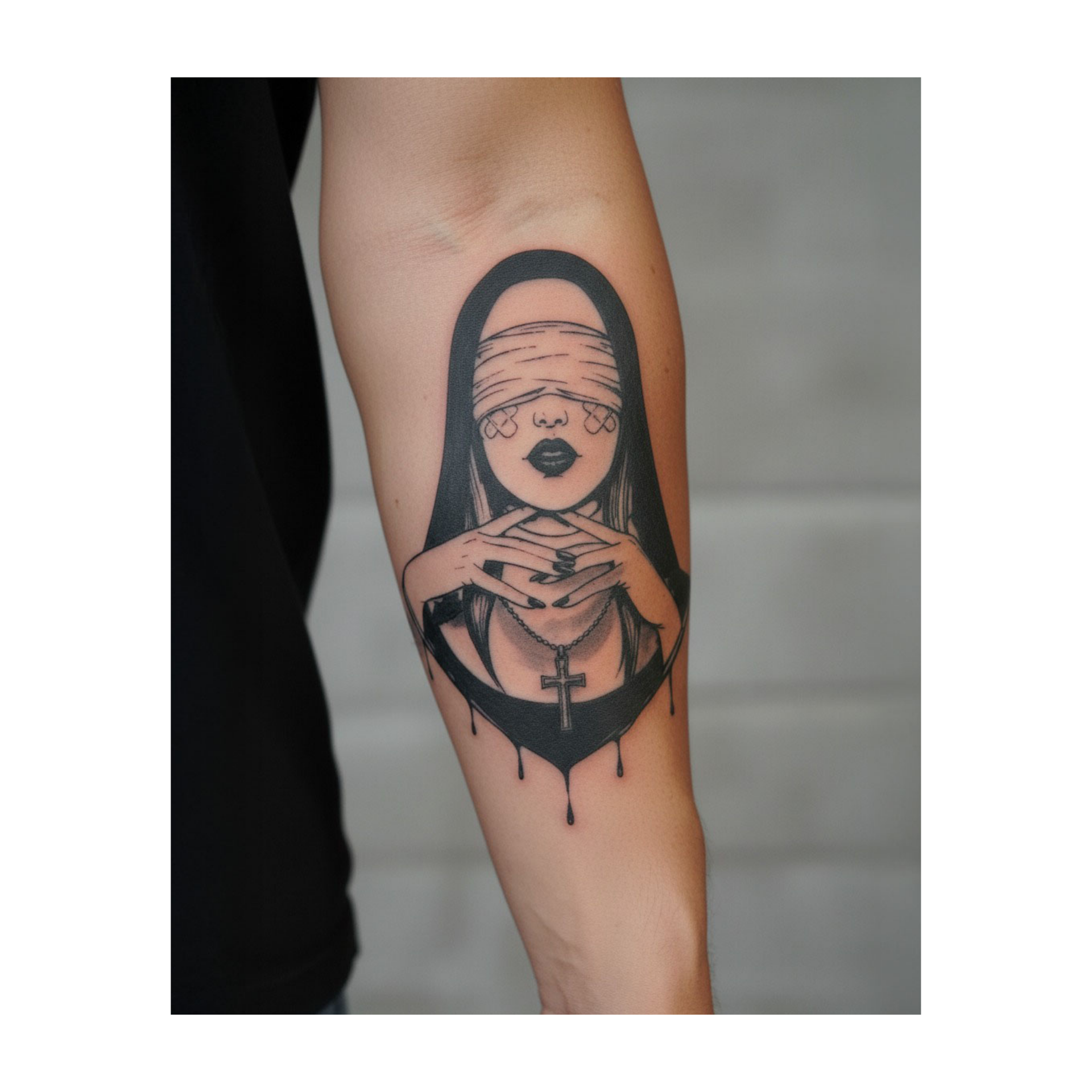 A Chicano-style tattoo of a woman with bandaged eyes and crosses as patches, holding her hands together with a cross necklace. It shows mystery, silence, and faith even when sight is lost.