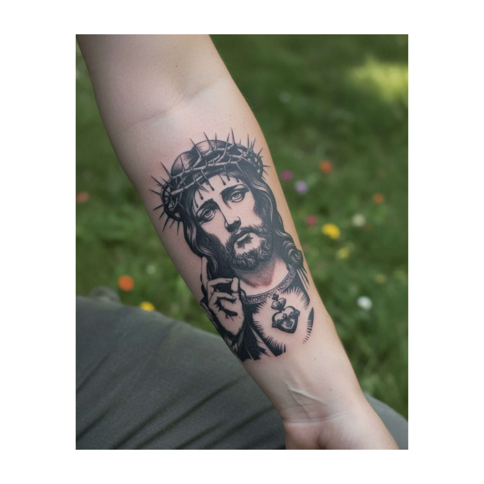 A realistic-style tattoo of Jesus with a crown of thorns and the Sacred Heart glowing on his chest. It shows love, sacrifice, and hope, reminding of light even through pain.