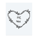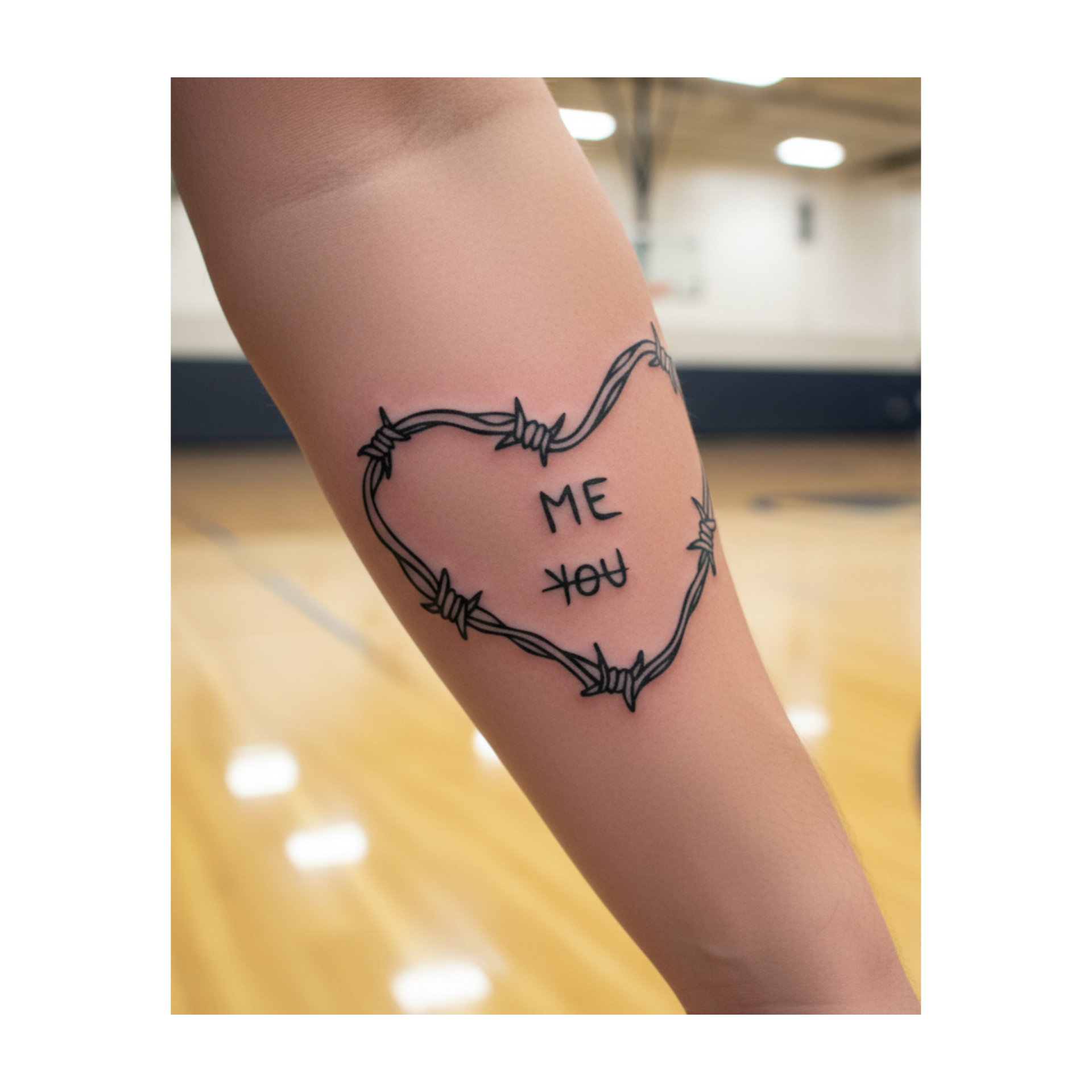 A minimalist tattoo of a heart made from barbed wire. Inside, the word “YOU” is crossed out and replaced with “ME,” telling a story of tough self-love and strength, with a raw, edgy style.