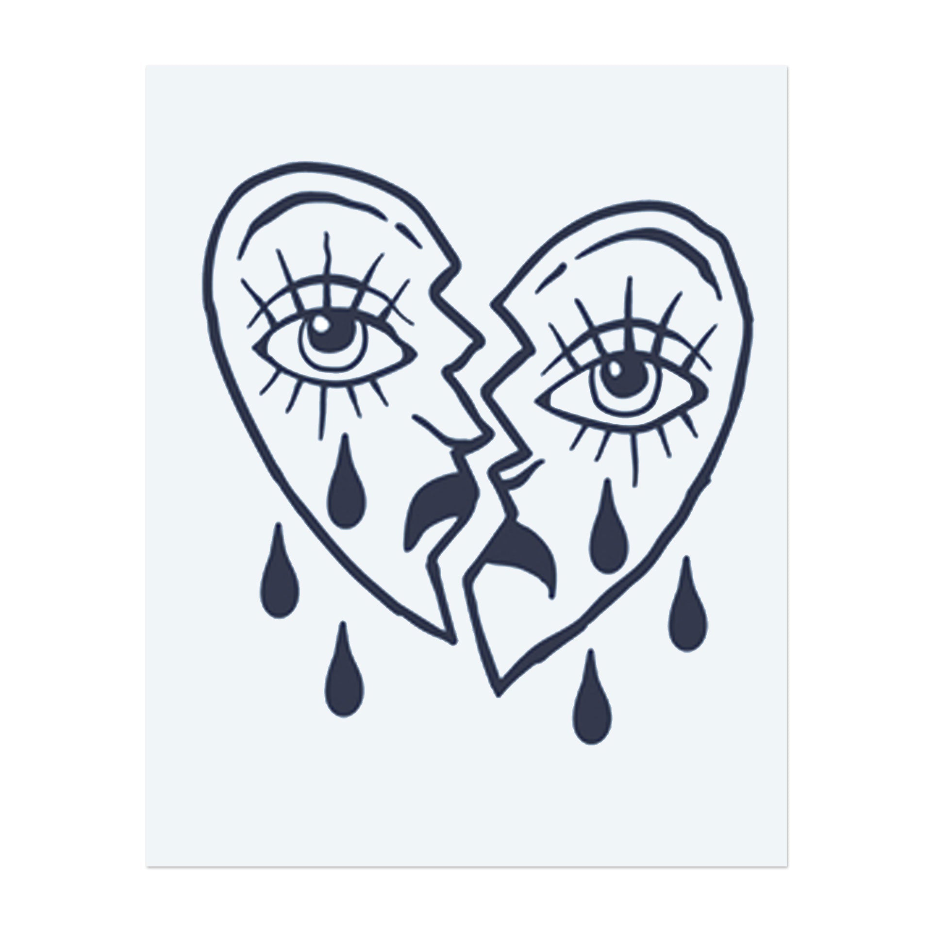 A broken heart with eyes and tears. Represents heartbreak, emotional pain, or a vulnerable state. A striking and emotionally charged design.