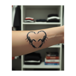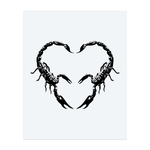 A bold tribal tattoo of two scorpions facing each other, their tails curved to form the shape of a heart. It tells a story of fierce love, mixing danger and passion in a striking design.