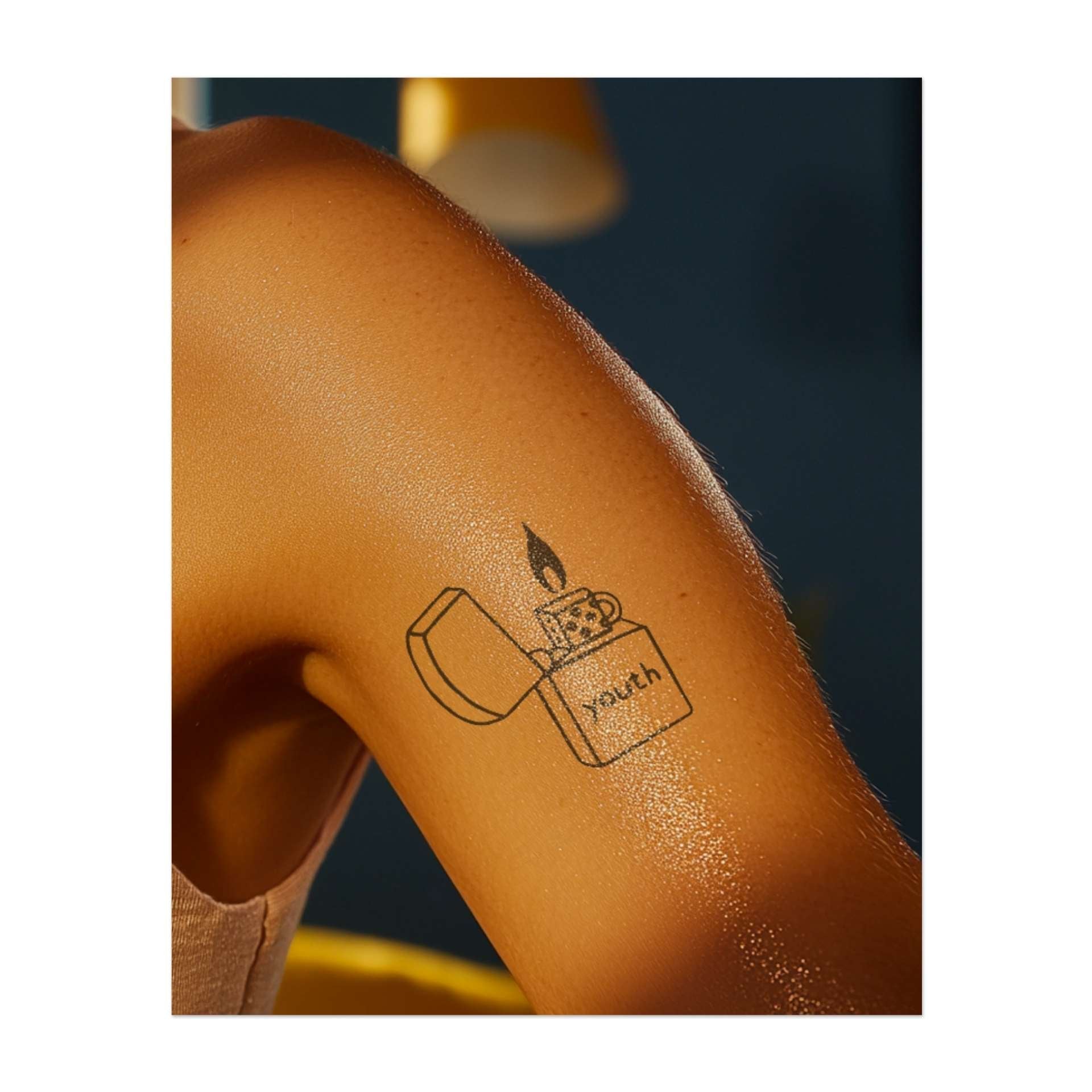 A lighter with a mug on top, labeled "youth." Represents rebellion, fleeting moments, or a symbol of youthful energy. A unique and symbolic design.