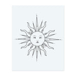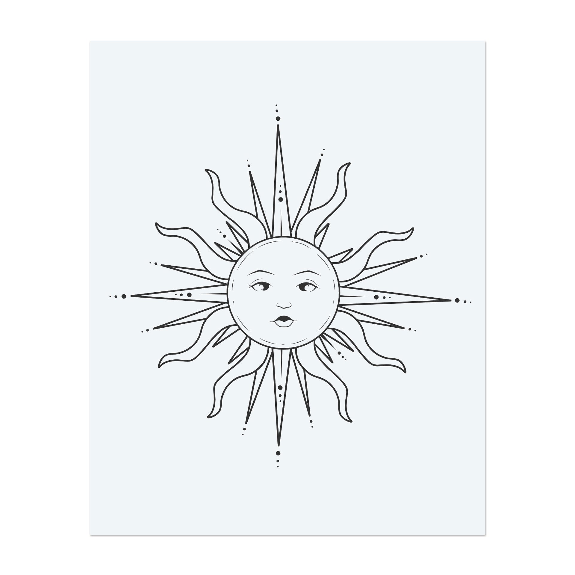 A radiant sun with a serene face, surrounded by alternating straight and wavy rays, embellished with tiny dot accents. This richly detailed design combines cosmic energy with classic charm, symbolizing warmth, clarity, and inner light.