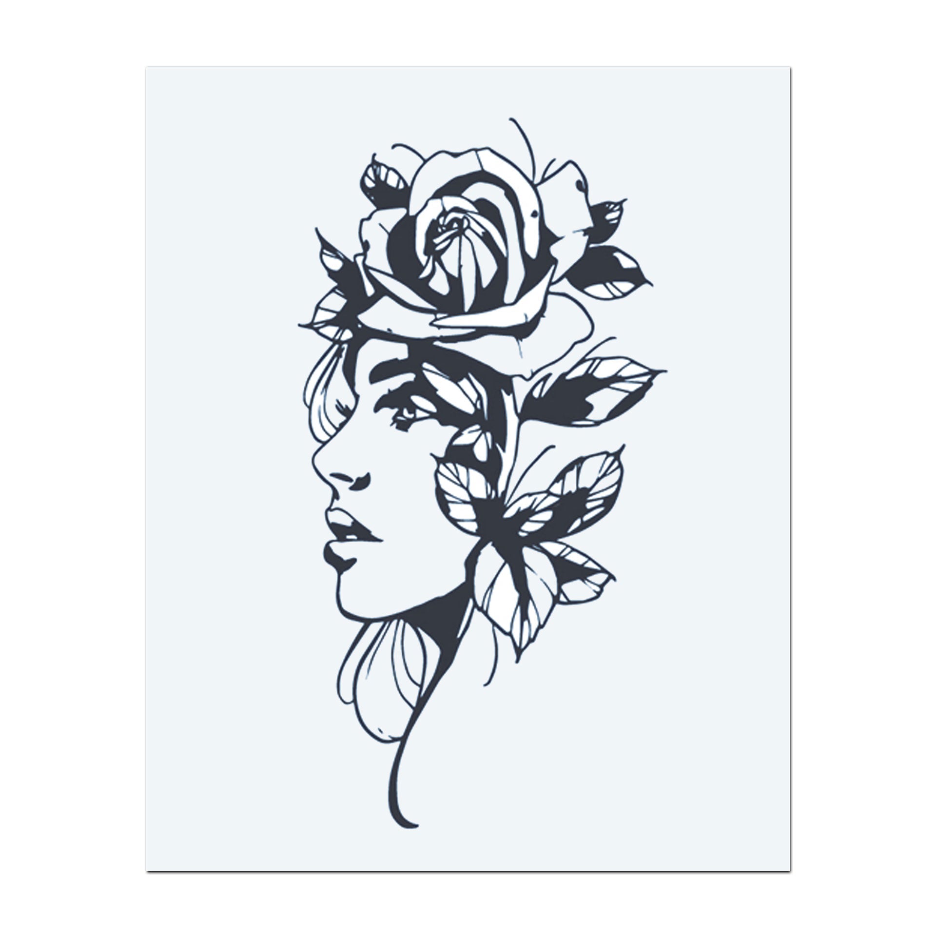 A woman’s face blends with a rose and leaves in a clean, minimalist style. This tattoo shows beauty and nature together, reminding you to stay strong and bloom softly.