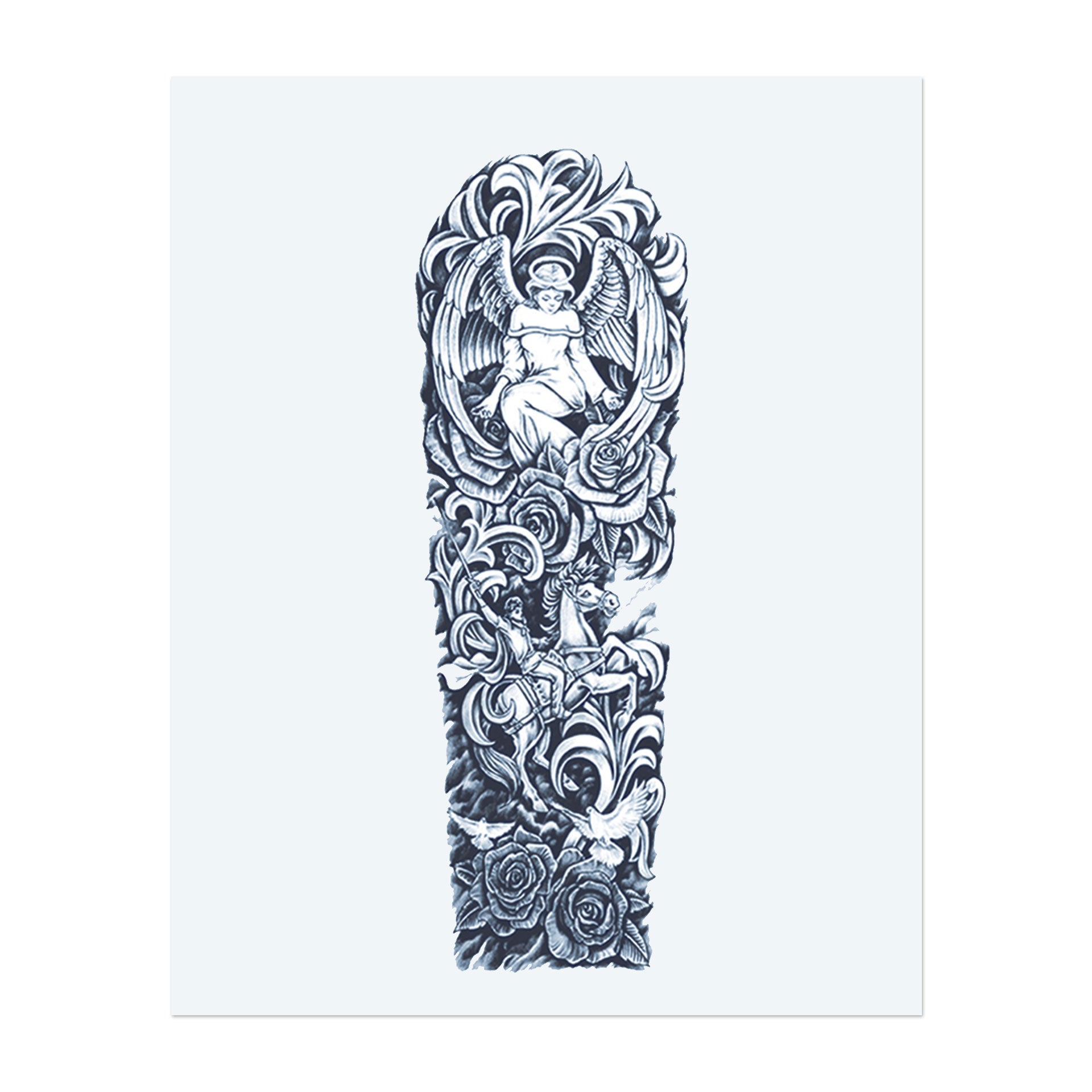 This sleeve features an angel surrounded by roses, with a knight on horseback below and doves flying above. It symbolizes protection, purity, and the balance between love, strength, and peace.