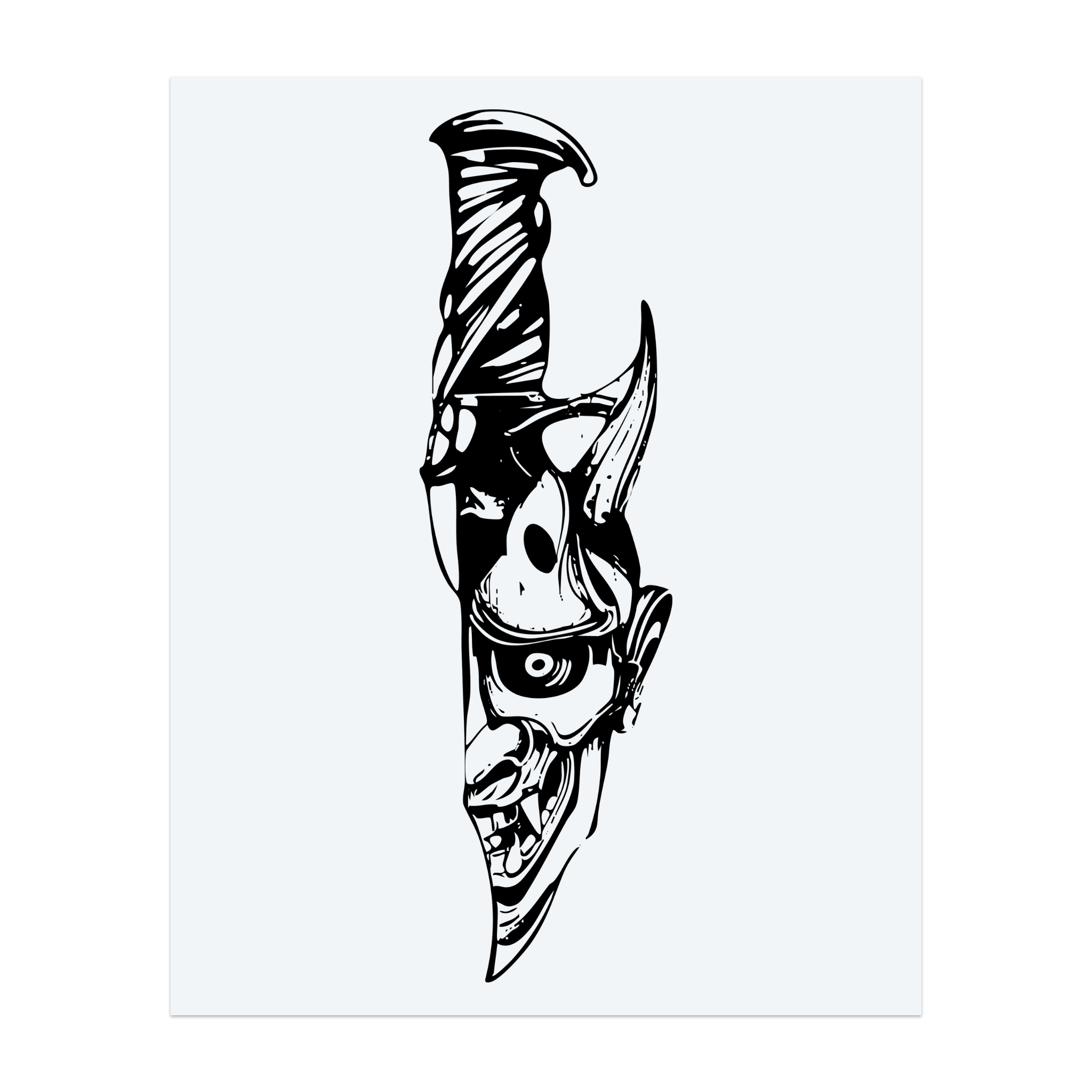 A twisted dagger merges with a fierce Oni mask, its horns and teeth showing rage and strength. This bold Japanese-style tattoo mixes weapon and spirit, symbolizing power, danger, and hidden fury.