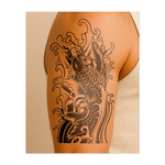 A dynamic koi fish leaps through swirling waves in this bold, traditional design. The detailed scales and fluid movements symbolize strength, endurance, and transformation. They recall timeless Eastern art and personal growth.