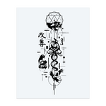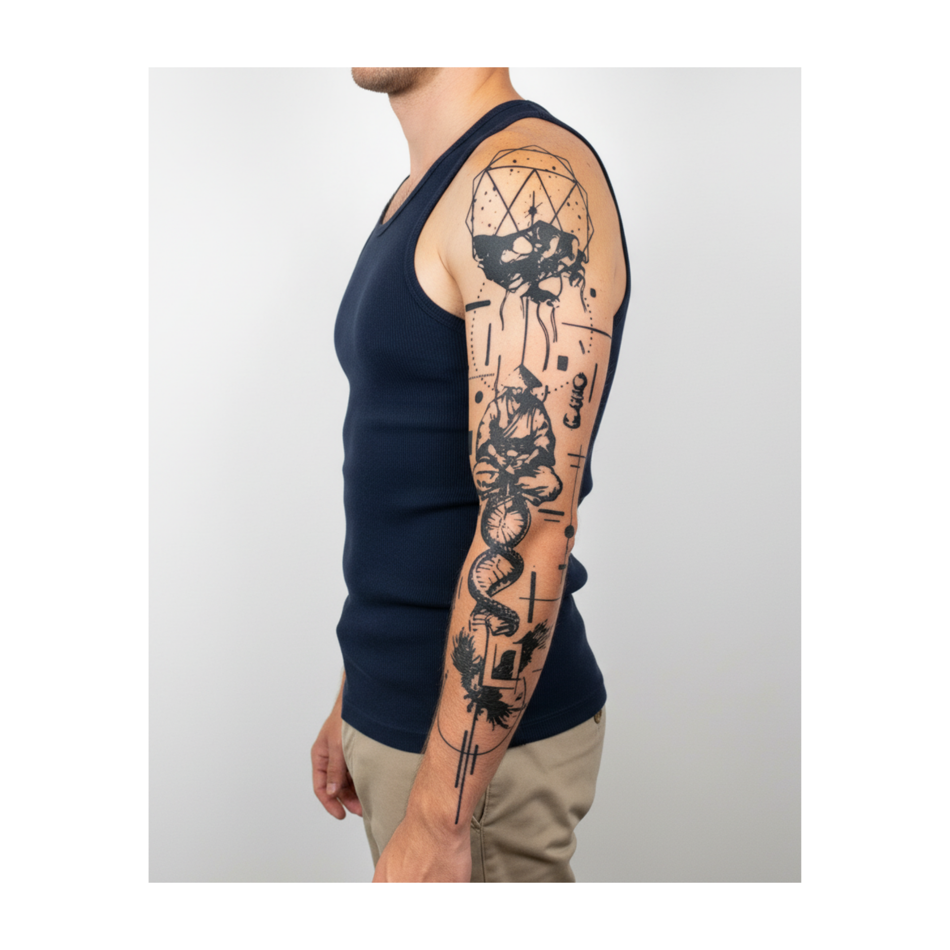 A monk sits in meditation with a coiled dragon rising beneath and symbols floating around. This geometric tattoo mixes wisdom, balance, and strength, showing peace and power joined as one.