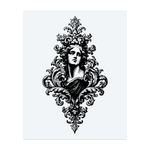 An ornamental blackwork tattoo of a graceful woman’s face framed by swirling baroque patterns. It tells a story of beauty and elegance, like a timeless statue brought to life in flowing art.