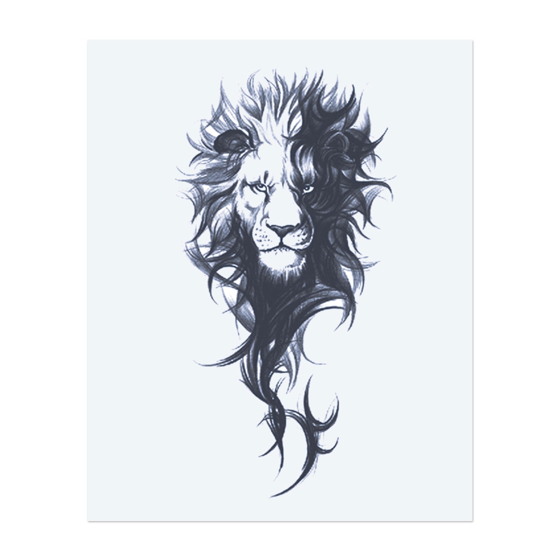 A black and white lion with a flowing, fiery mane looks calm but strong. This realistic tattoo shows the lion’s light and dark sides, ready to protect with courage and quiet power.