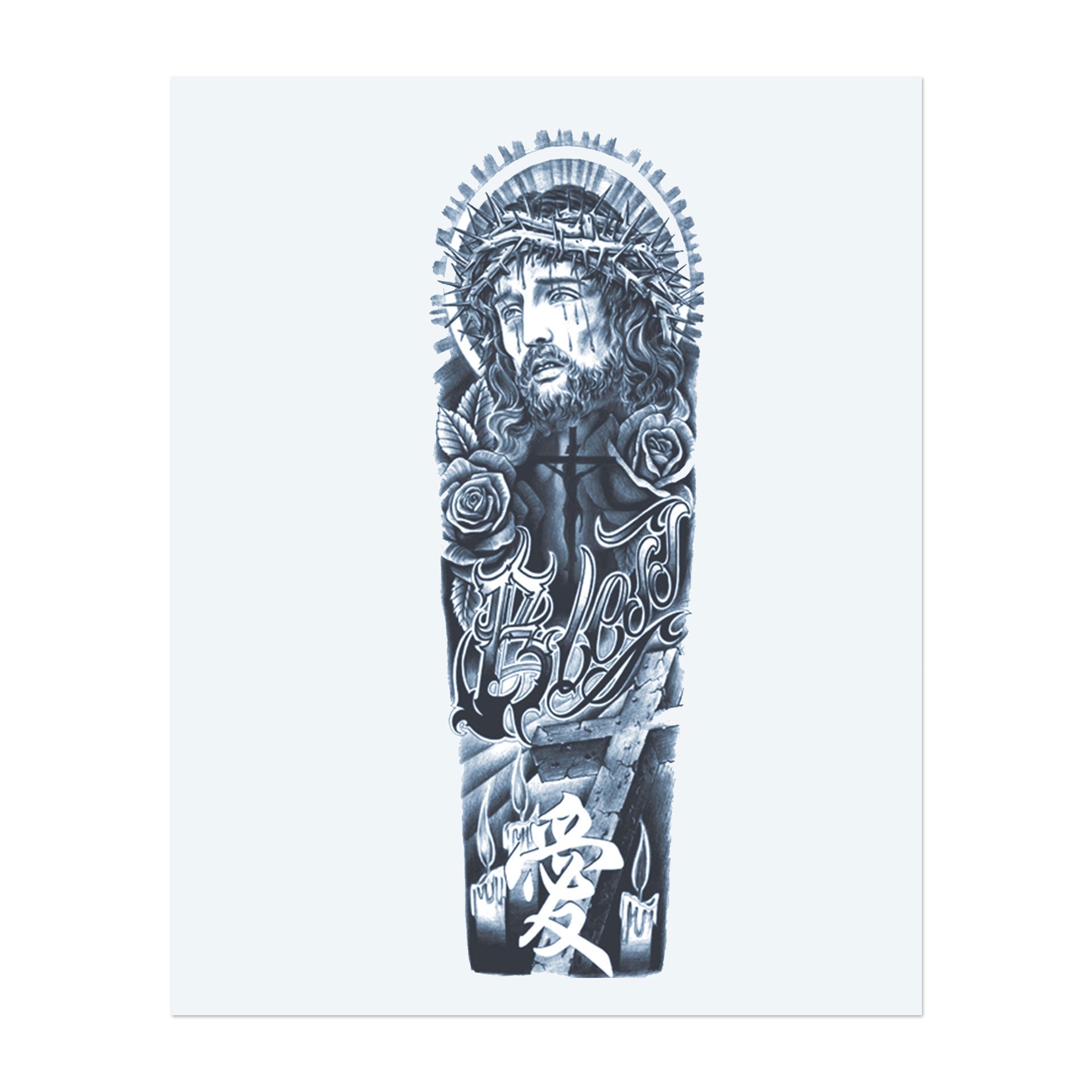 This sleeve portrays Jesus on the cross with thorns, surrounded by roses and candles. The words "Bless" and the Chinese character for "Love" symbolize sacrifice, faith, and the enduring power of love in the face of suffering.