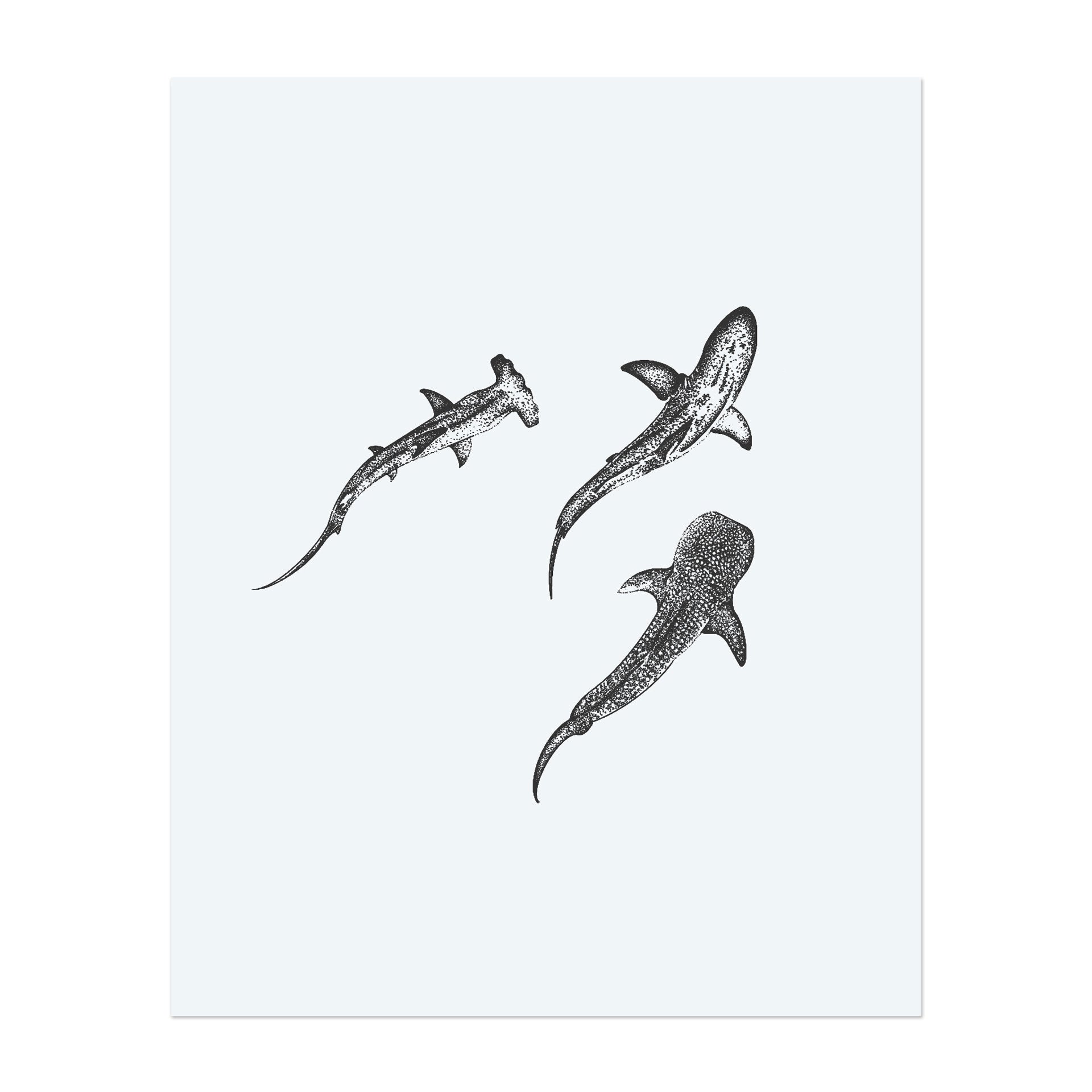A detailed set of three different shark species: hammerhead shark, great white shark, and whale shark. Designed using delicate dotwork techniques, the motifs exude dynamism, strength, and natural elegance—perfect for ocean lovers.
