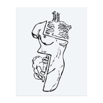 A surreal line-art tattoo of a human torso split into puzzle-like pieces, showing bones, muscles, and hands inside. It tells a story of how the body is made of many hidden parts fitting together.