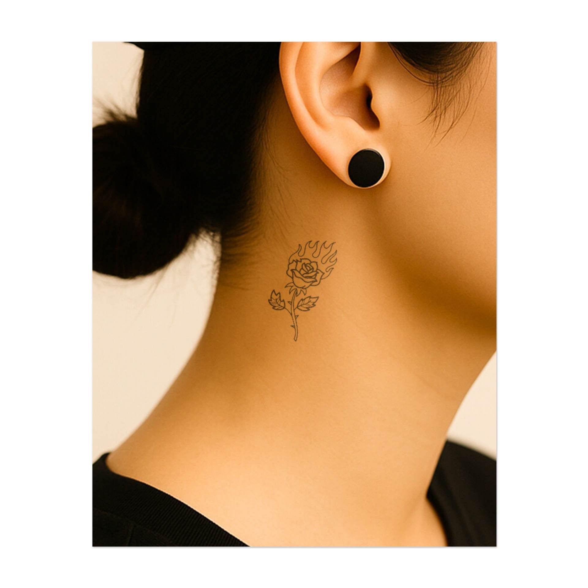 A beautiful rose with flames rising from its petals, symbolizing love's passion and intensity. This tattoo represents the balance between beauty and danger, perfect for those who embrace the fiery side of love and life.