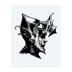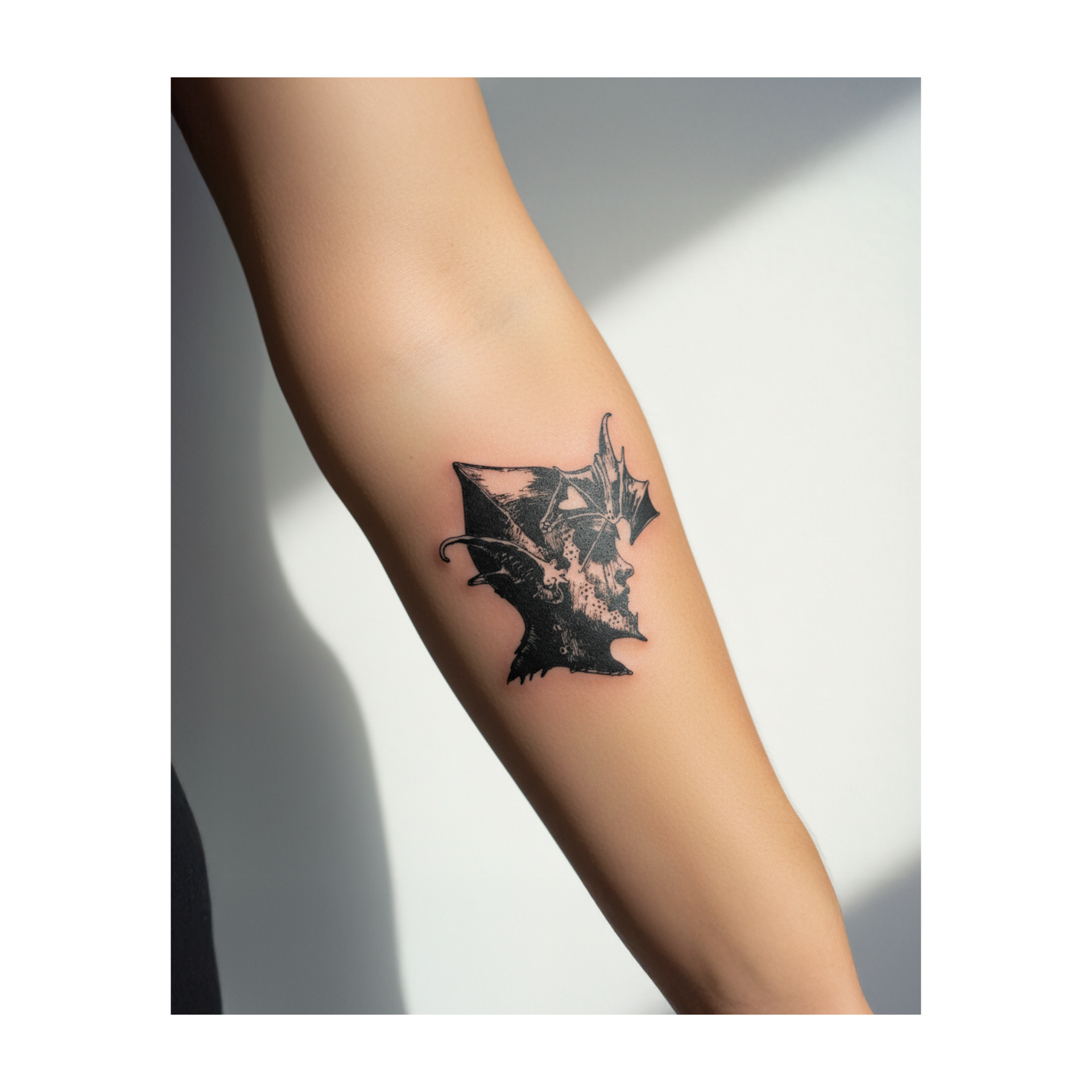 A dark blackwork tattoo of a side-profile face with sharp features and bat-like wings growing from the head. It tells a story of a ruler of the night, mixing human strength with vampire mystery.