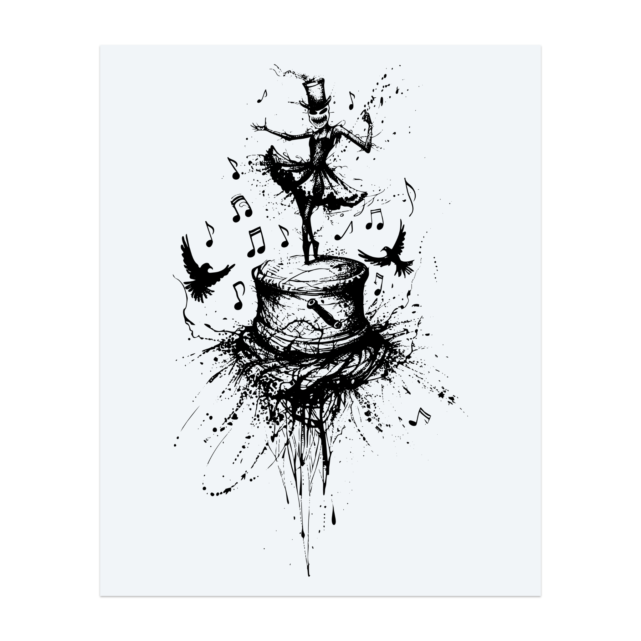 A spooky dancer twirls on a drum, her wide grin glowing as birds fly and music notes swirl. This blackwork tattoo feels like a haunted song, full of eerie rhythm and ghostly charm.