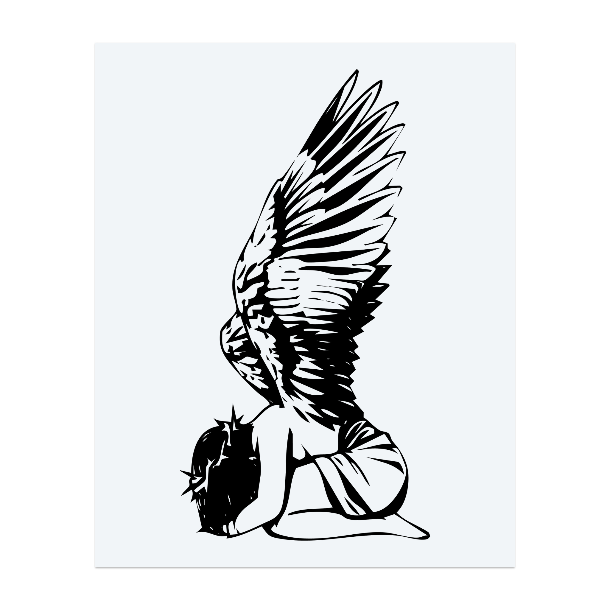 A blackwork tattoo of a kneeling angel with large wings, head bowed and wearing a crown of thorns. It tells a story of sorrow, faith, and strength, showing beauty even in struggle.