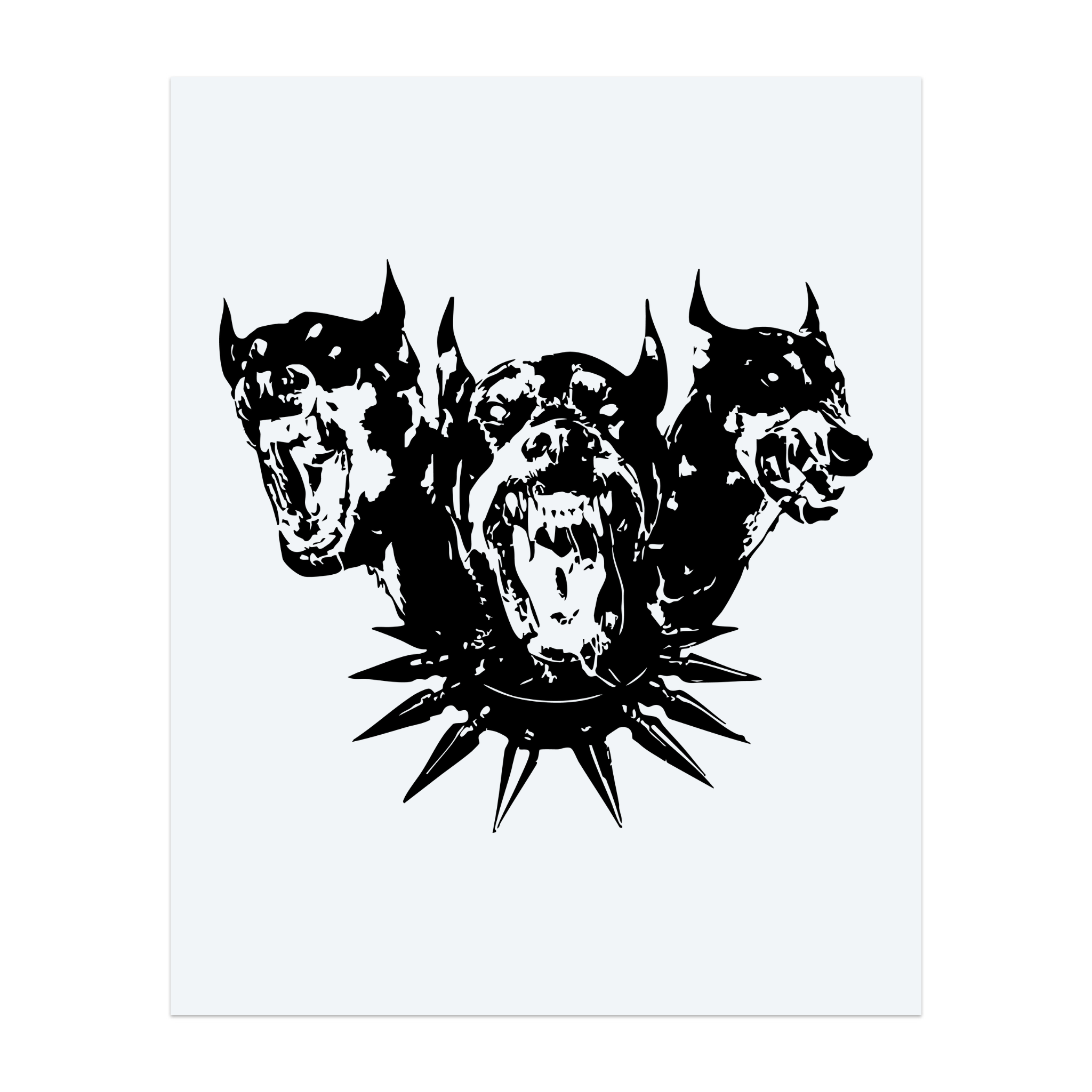 A blackwork tattoo of a three-headed dog with sharp teeth and a spiked collar. It tells the story of Cerberus, the guardian of the underworld, symbolizing power, protection, and fearsome loyalty.
