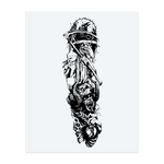 A dark tattoo in bold blackwork style showing a plague doctor with a staff and potion above a roaring horned demon. It tells a story of death, fear, and battles between shadow and sickness.