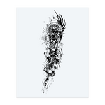 A bold tribal tattoo showing a saint-like figure with a halo, mixed with skulls, bones, and shattered patterns. It feels powerful and chaotic, telling a story of holiness clashing with death and darkness.